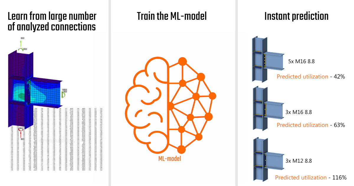 A large number of connection configurations are generated and evaluated using CBFEM. Each of these cases, defined by its geometry, loading, plates, welds and bolts, produces accurate results in terms of utilization. This dataset is then used to train a machine learning model that captures the relationship between input parameters and structural response. The result is a predictive model that can estimate the utilization of a connection, similar to a well-prepared Excel.