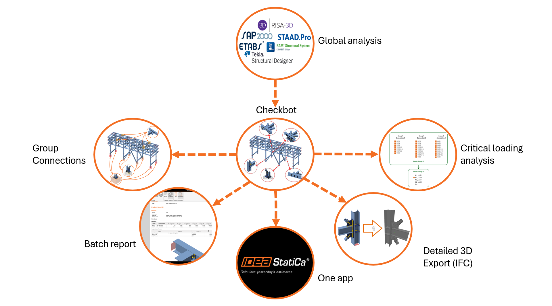To address these challenges, many engineering firms are turning to IDEA StatiCa not just for its analysis capabilities but for the workflow optimizations it offers. Three specific tools, Checkbot grouping and batch design, parametric templates, and the new connection wizard, are helping teams streamline their processes and maintain efficiency across projects of all sizes.