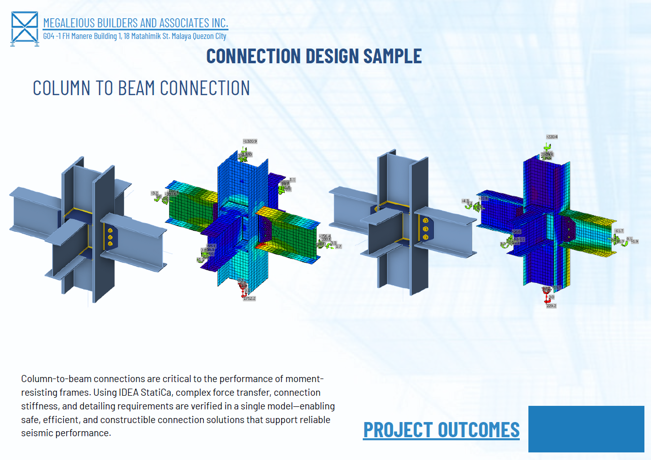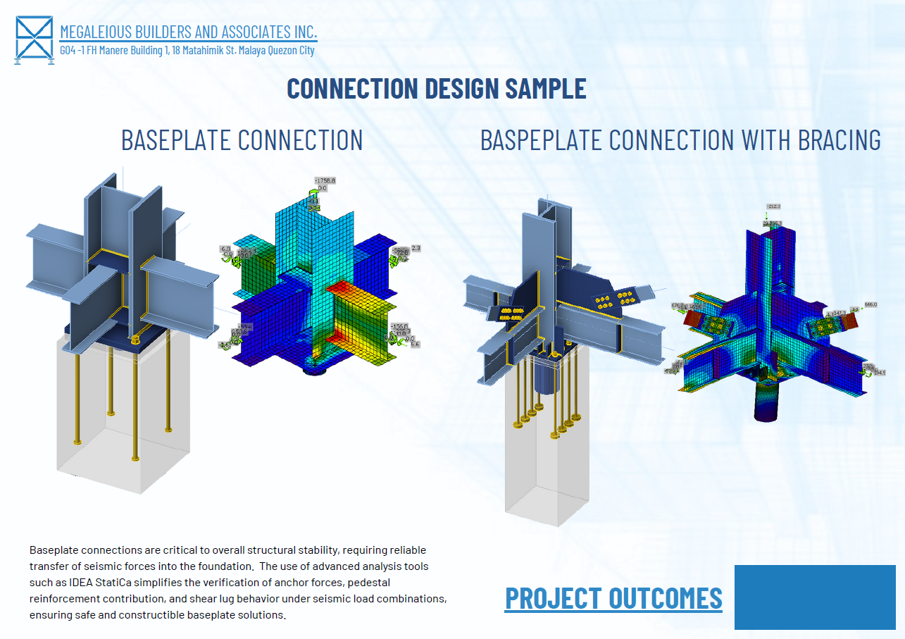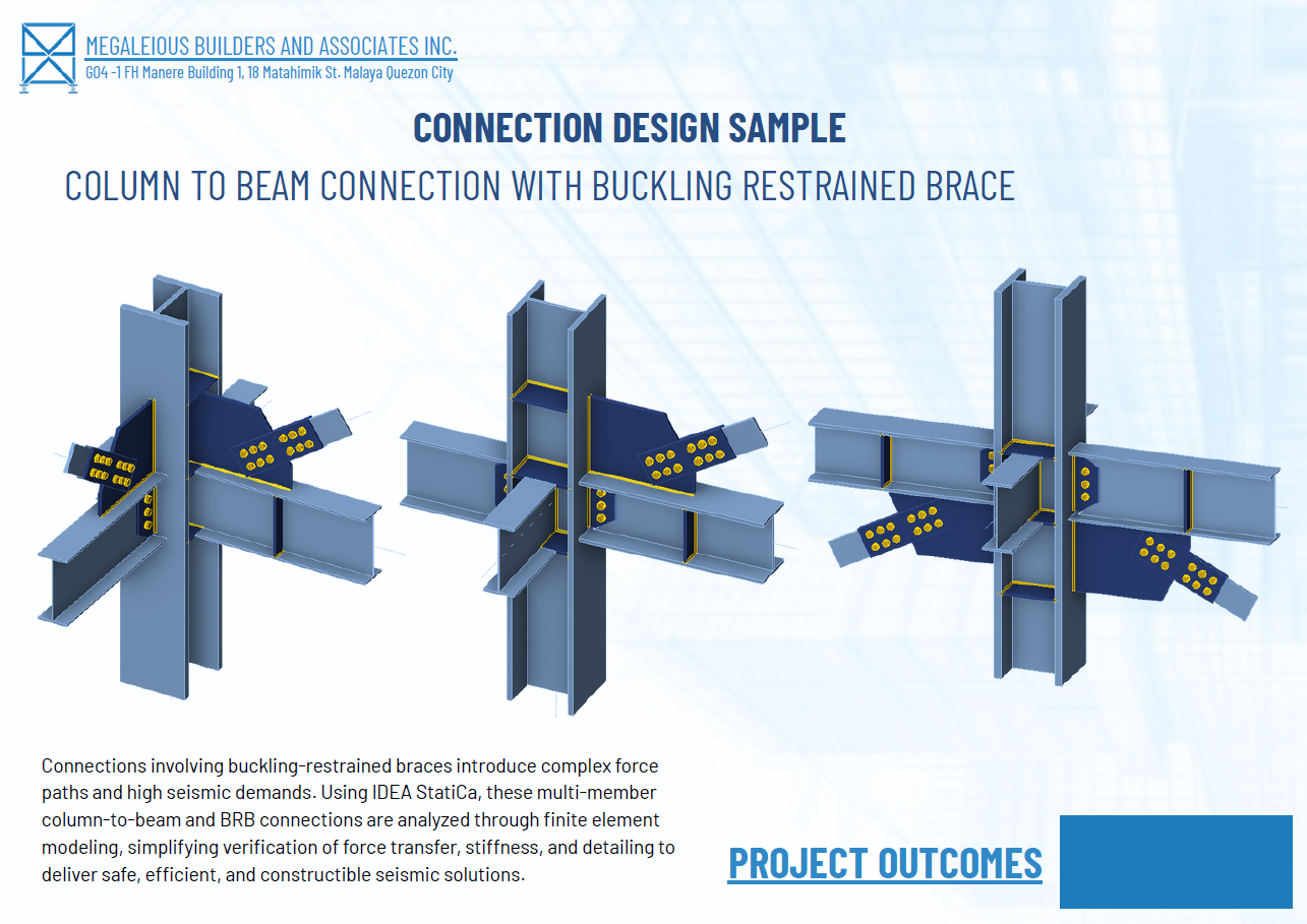 “Given the complexity of the dual SMRF–BRBF system and the critical nature of healthcare facilities, advanced connection analysis was essential to ensure reliable seismic performance and practical detailing. Stress-based finite element analysis reduced connection design and checking time by approximately 60%, minimized redesign and coordination cycles by up to 50%, and enabled optimized plate, weld, and anchor detailing. This delivered 10-20% material savings on critical connections,” said Engr. Marklou Balabbo, Founder and Principal Engineer of Megaleious Builders and Associates. “IDEA StatiCa allowed our team to move beyond conservative assumptions, enabling confident engineering decisions that balanced safety, constructability, and efficiency.”