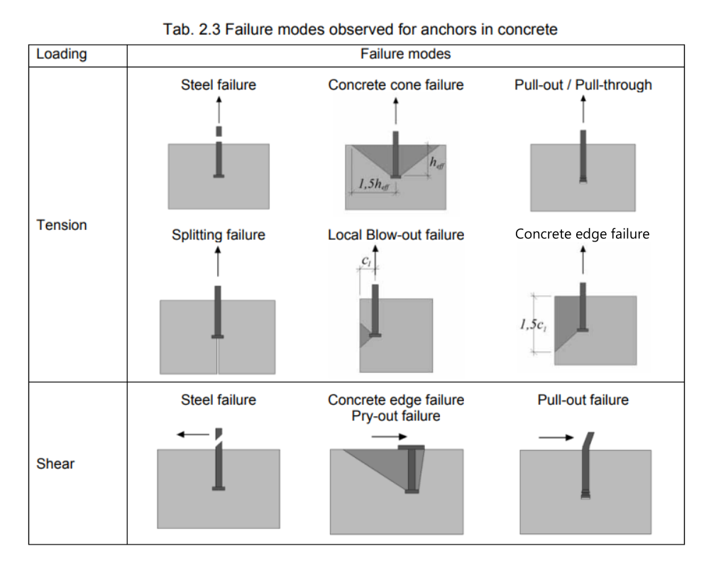 Figure 1: Scheme of failure modes – picture from Design of Steel-to-Concrete Joints Design Manual II