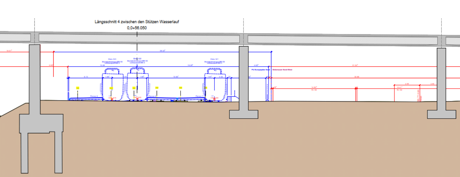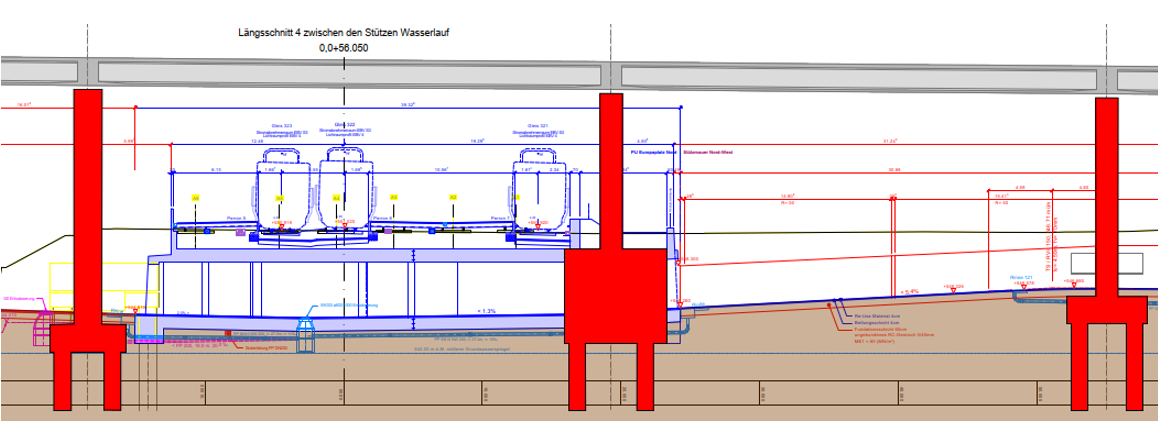 The viaduct (built 1974–1977) consists of prestressed box girders (spans ranging from 26.5 to 38 meters) with massive prestressed cross-beams spanning the piers. These piers will be replaced in sections during construction. To do this, the viaduct is lifted using a temporary underpinning system (massive welded steel girders on scaffolding towers) and hydraulic jacks. The existing piers are unloaded and dismantled, after which new, longer piers are constructed so that the ground can be lowered.