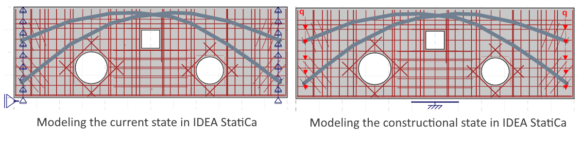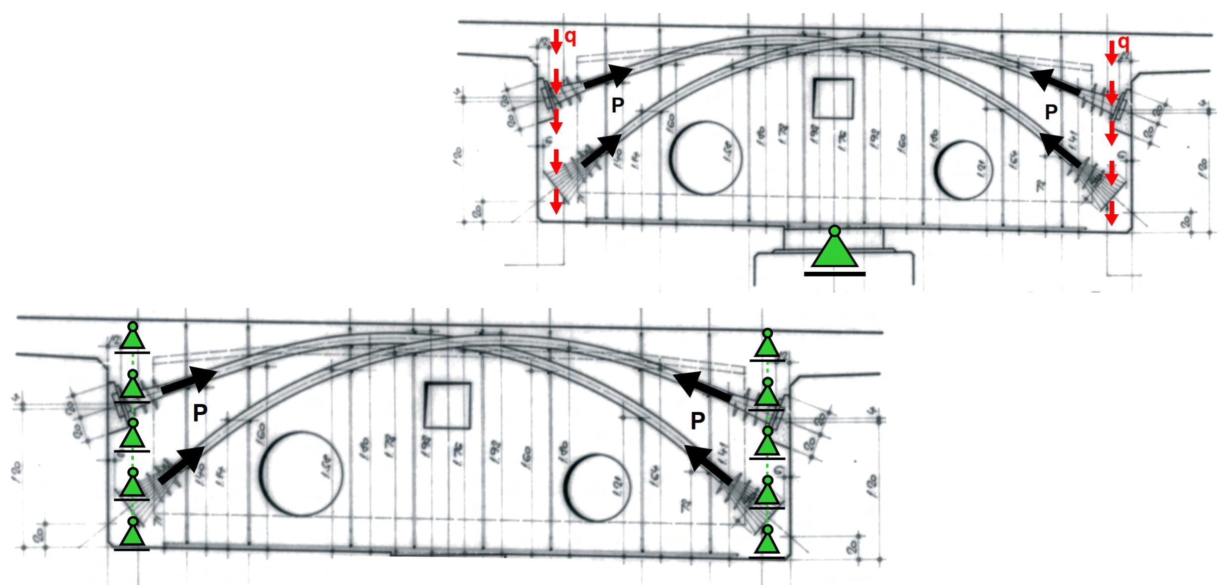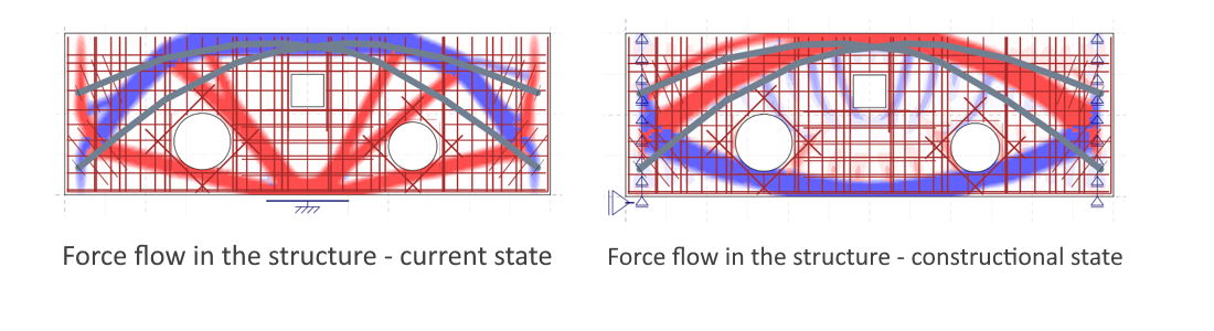 Cross-section of the bridge girder showing a comparison of force distribution in the existing structure (top) and during construction (bottom)