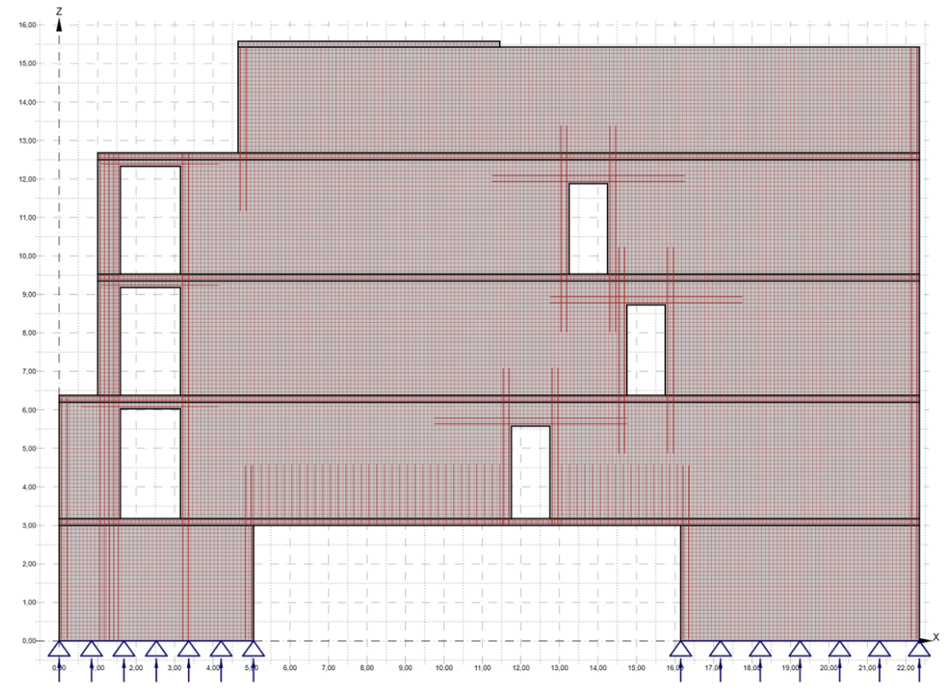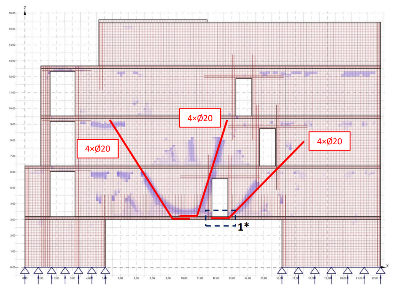 A deep beam runs along Axis “2” through all five building levels, (basement, ground floor, first and second floors, and roof. At basement level, it spans 11.1 meters without support, while each upper floor contains smaller door openings intentionally offset in plan. To cope with higher actions, the basement beam is 25 cm thick, reducing to 20 cm above grade. Basement walls use C30/37 concrete; upper levels use C25/30, with B500 reinforcement and Q385 meshes on both faces. Around openings, confinement reinforcement of 4ר20 ribbed bars safely redirected forces. With no lintel between the large basement opening and the ground-floor doorway—only a slab spans that gap, the geometry demanded a realistic RC model rather than simplified beam theory.