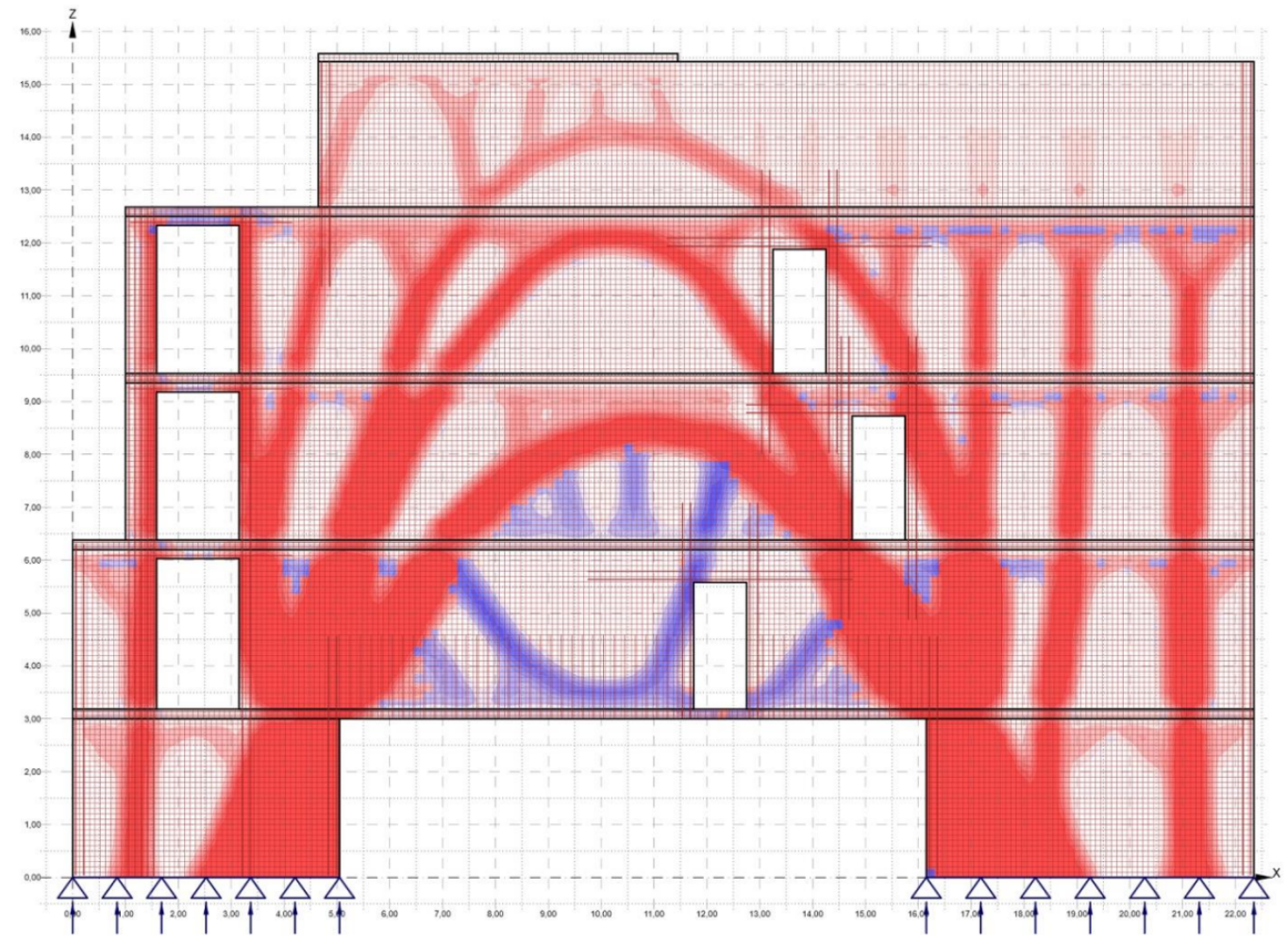 Topology Optimization proved decisive. By running iterations with 20% and 40% effective volumes, the tool revealed clear force paths and reinforcement trajectories. This confirmed where inclined reinforcement was essential (around the basement opening and staggered doorways) and where extra steel would add no value. The team added three groups of 4Ø20 inclined bars, achieving safety without heavy columns or deep downstand beams.