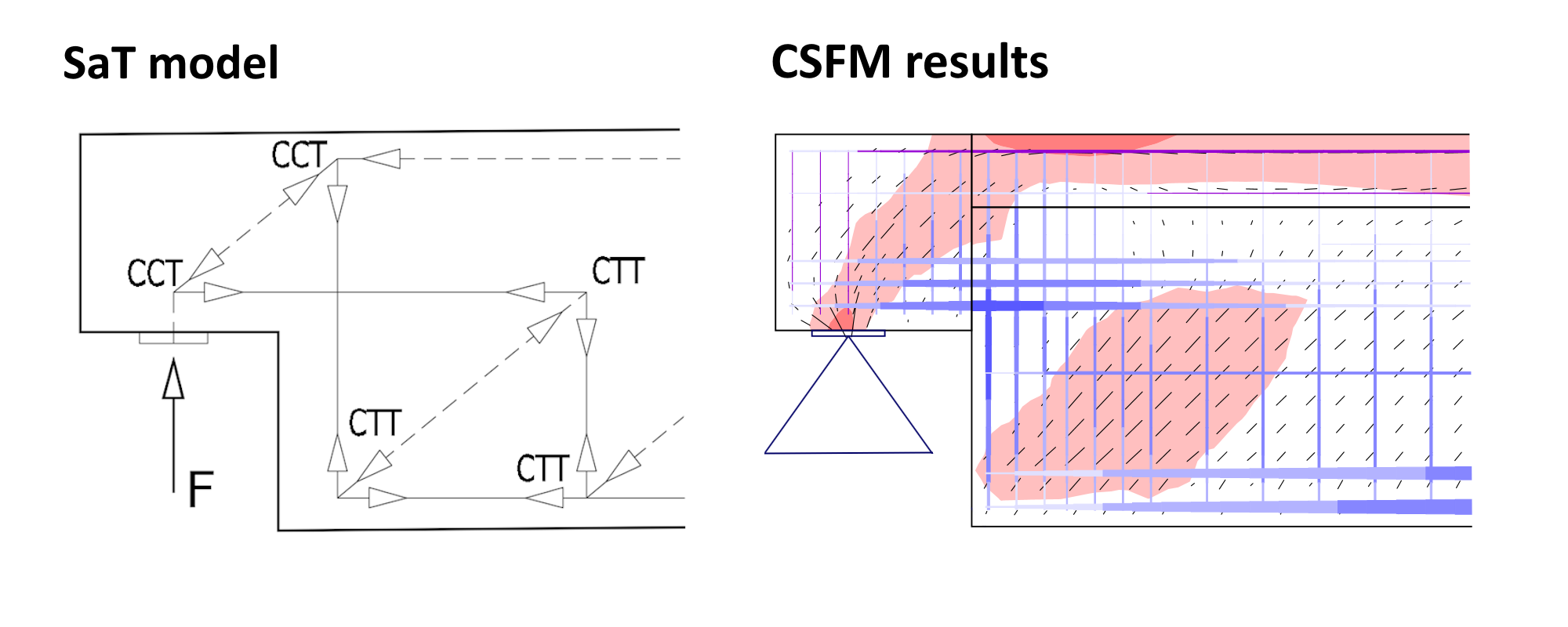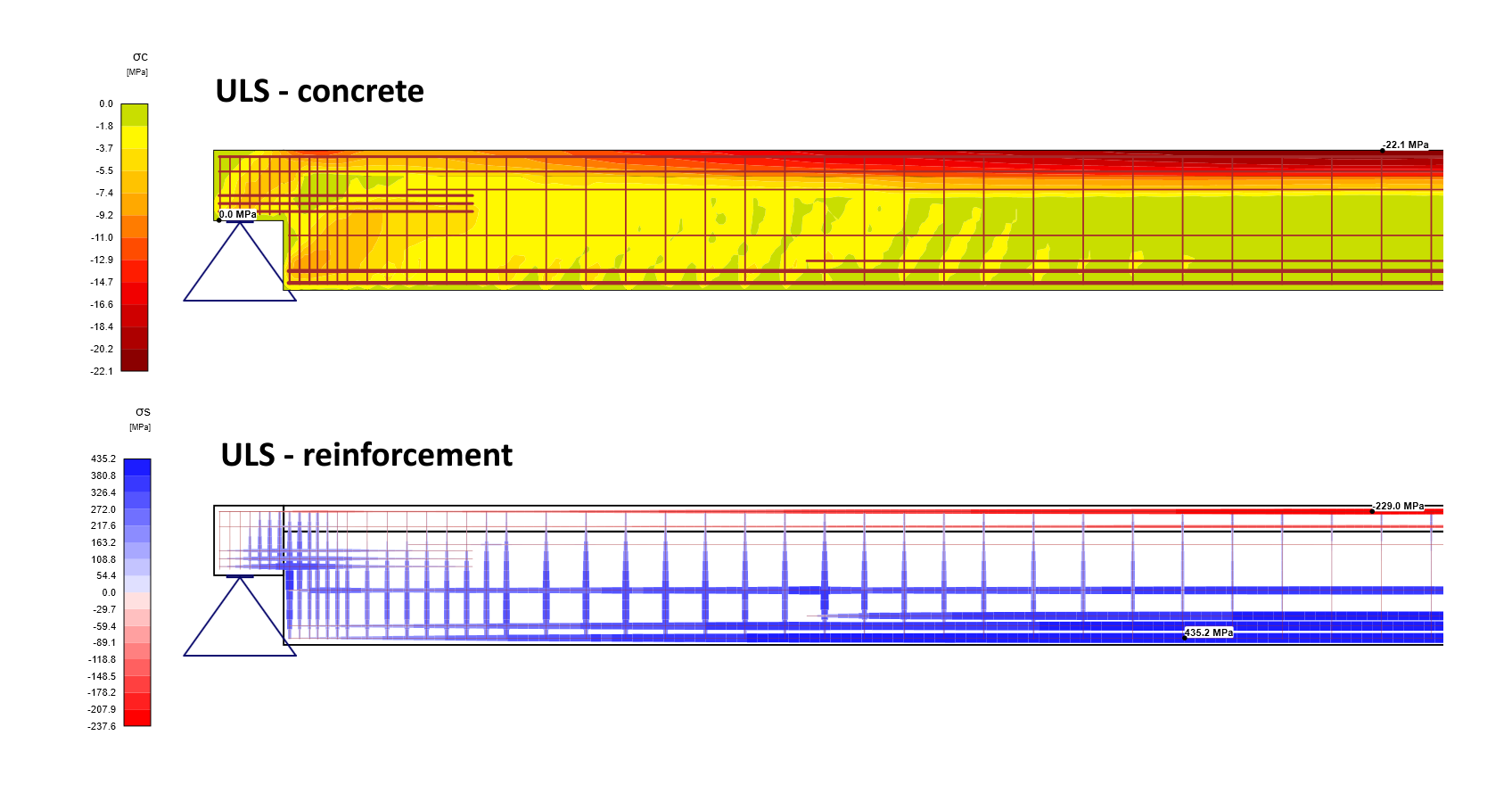 The dapped end can typically be analyzed using a Strut-and-Tie analogy, which is described in the literature for this D-region. However, a proper solution using the SaT model can be a lengthy iterative process. The exact geometry of the truss often needs to be determined through several iterations, depending on the actual reinforcement design. Additionally, assessing the anchorage of the reinforcement at the truss nodes is a complex task. Moreover, the SaT model is used solely for evaluating the ultimate limit state, not for serviceability limit state (cracks, deformations, stress limitations).