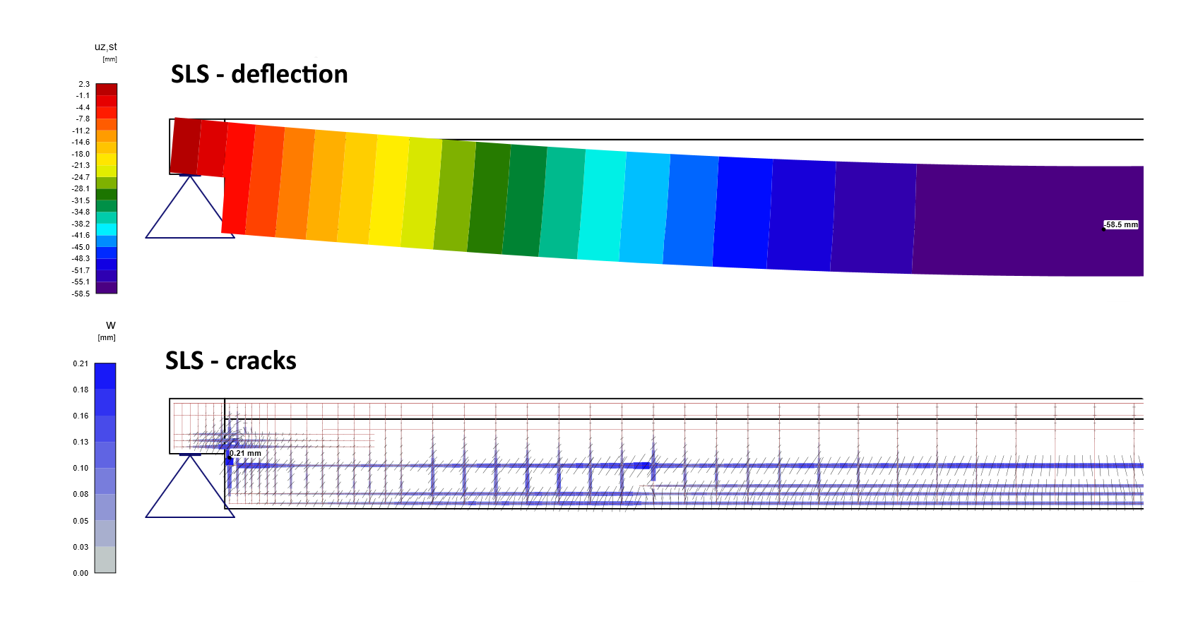 For a detailed assessment of the purlin support, the IDEA StatiCa Detail application was used, as it eliminates the aforementioned disadvantages of the SaT models. The CSFM method, implemented in the Detail application, is based on standard conservative assumptions for the design of reinforced concrete structures (concrete does not carry tension). It allows for the assessment not only of the ultimate limit state (including anchorage of reinforcement) but also of the serviceability limit state, including evaluation of crack widths and deformations in the D-region.