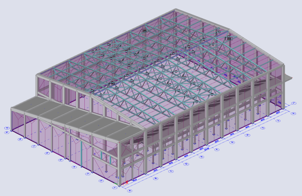 Further complexity was introduced by the layout geometry — with the first roof grid featuring a single pitch at 9° and the remaining spans shaped as double-pitched roofs at 6°. These variations in slope altered load paths and affected how forces were introduced into joints. Additionally, interfloor concrete slabs, including the stepped and inclined spectator seating, added asymmetry to the vertical loading pattern, increasing the importance of accurate modeling and analysis.