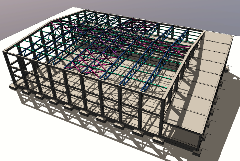 \[ \textsf{\textit{\footnotesize{3D model of the structure in SCIA Engineer}}}\]