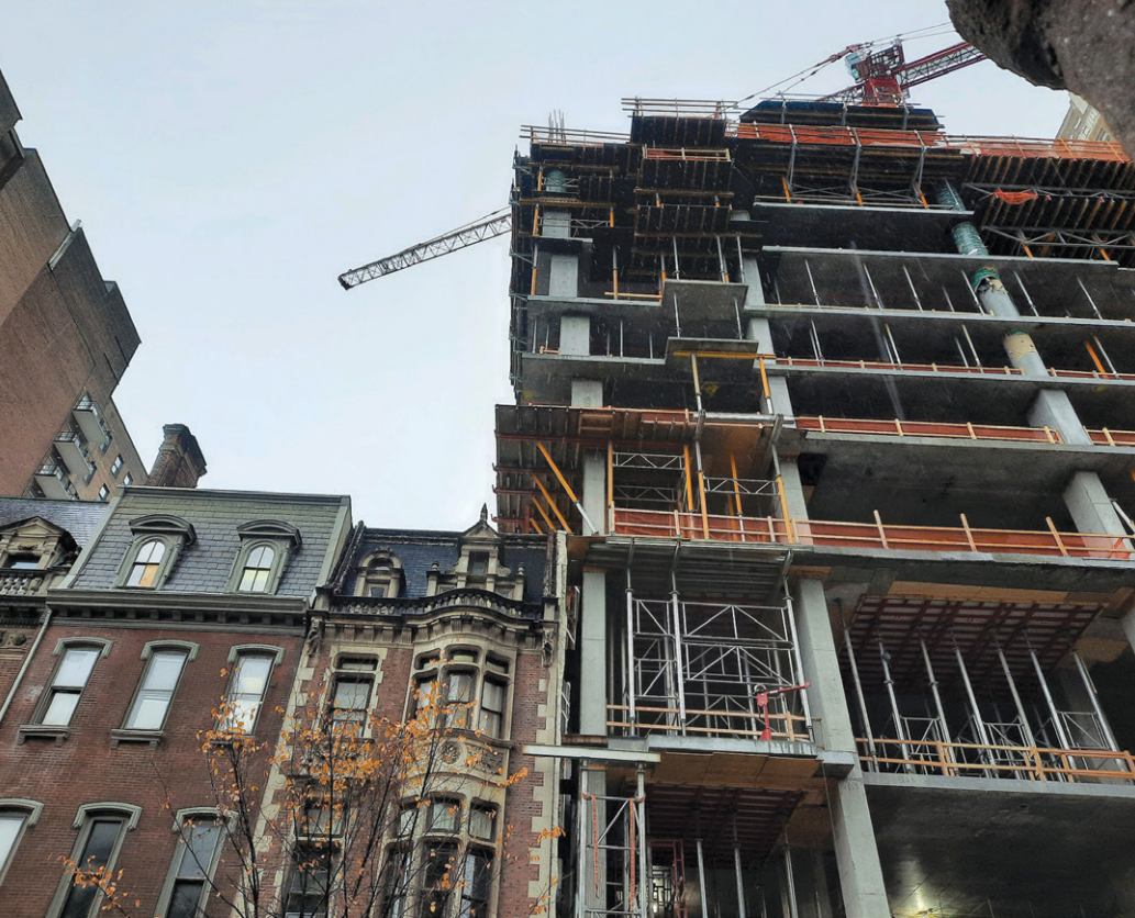 A key structural challenge was preserving an adjacent three-story historic building while maximizing floor area. To achieve this, engineers implemented walking columns, gradually shifting load-bearing columns over four floors to support the 40-plus stories above.