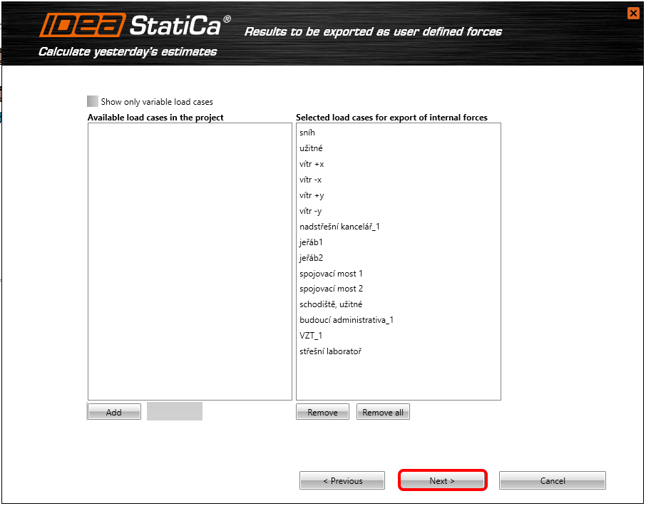Přidáte všechny nahodilé zatěžovací stavy z programu Axis VM. Zatěžovací stavy jsou načteny jako uživatelem zadané vnitřní síly.