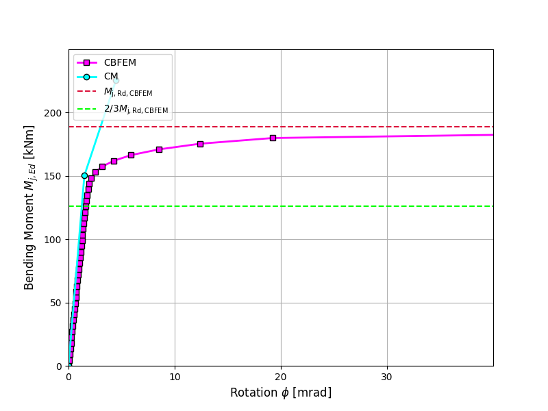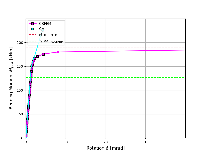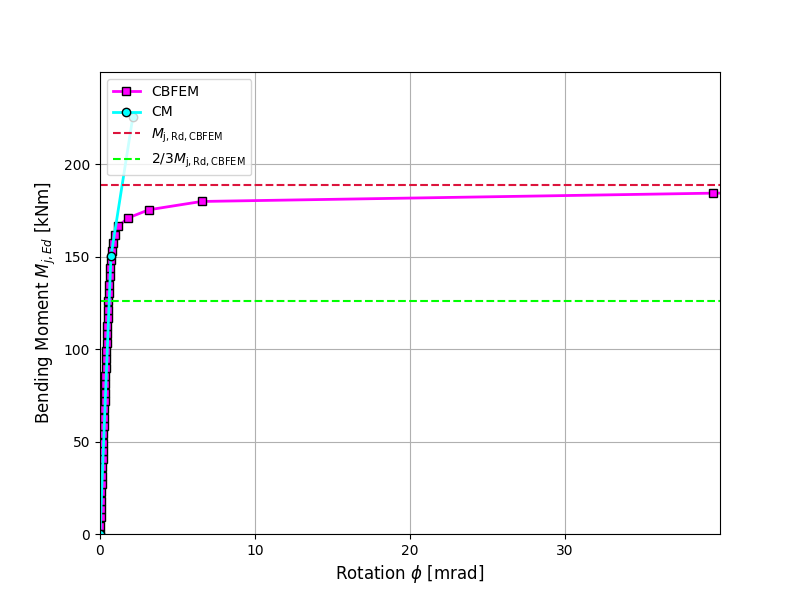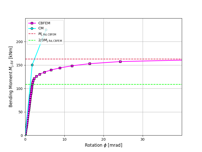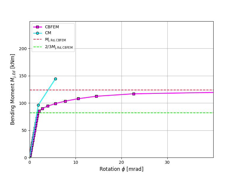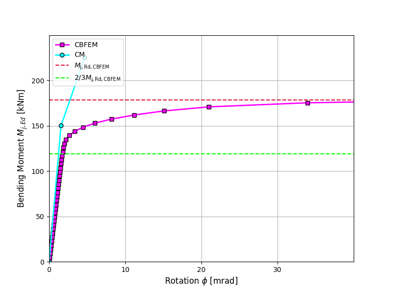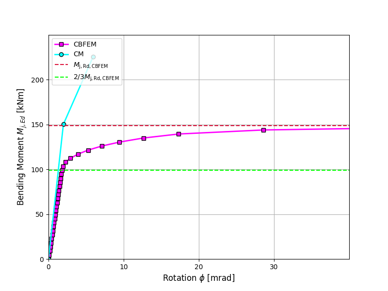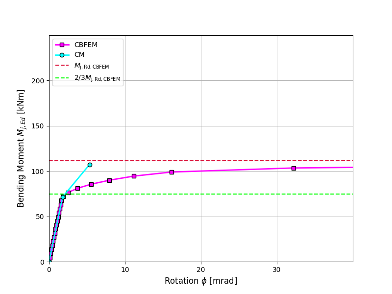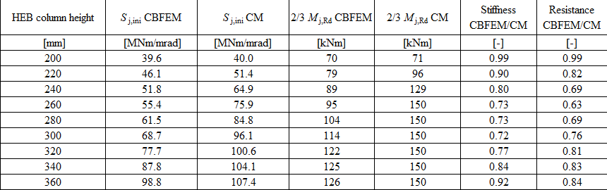 Detailed information about the prediction of stiffness in CBFEM may be found in chapter 3.9. The CBFEM analyses allows to calculate secant rotational stiffness in any stages of loading. The design resistance is reached by 5% plastic strain in a component column web panel in shear. The rotational stiffness calculated by CBFEM compared with CM. The comparison shows good agreement in initial stiffness and correspondence of joint’s behavior. The calculated stiffness from CBFEM and CM are summarized in Fig 10.2.2.