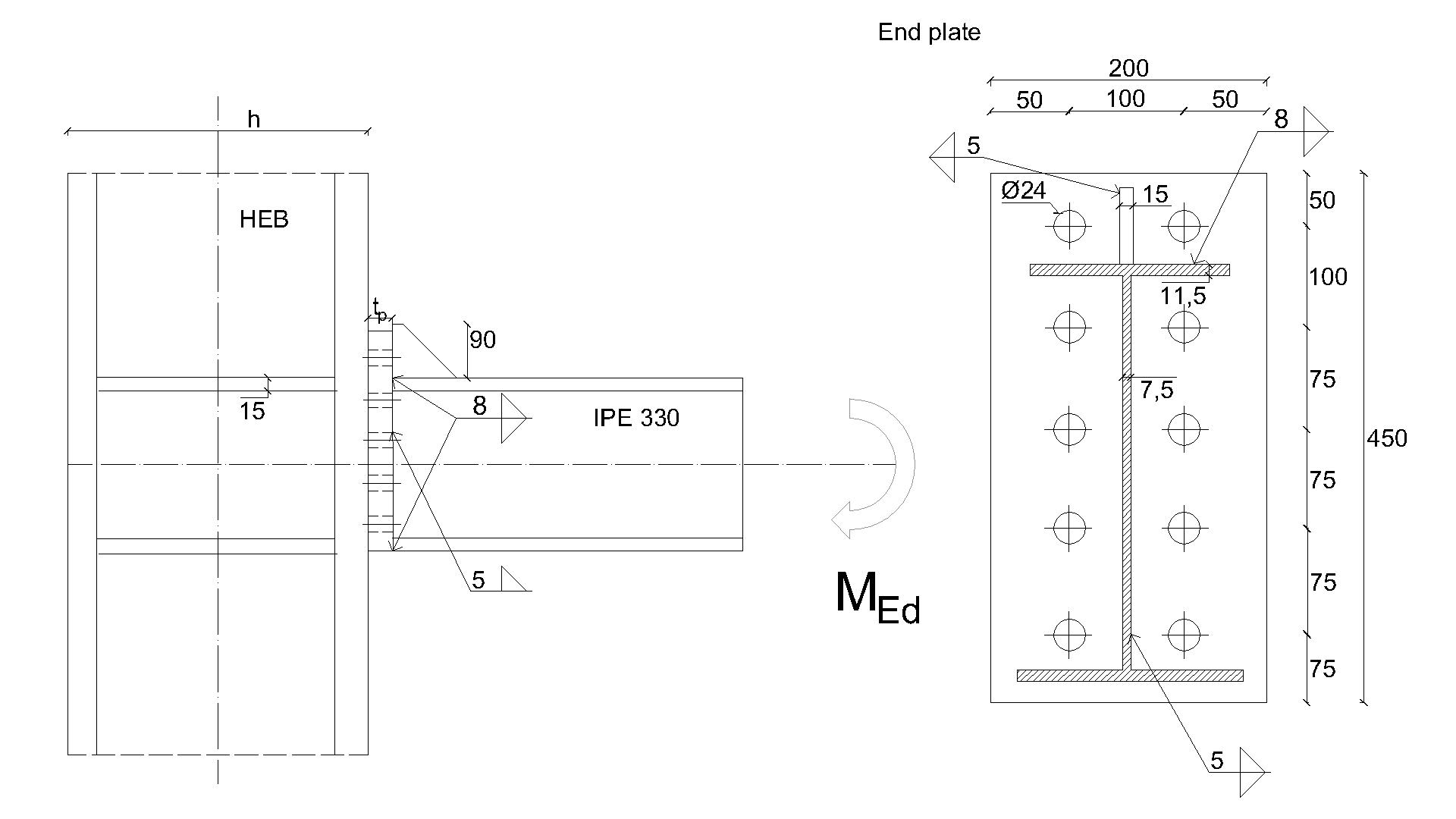 An open section beam IPE 330 is connected with bolted end-plate to a column HEB 200 in the example. The end-plate thickness is 15 mm, the bolt type is M24 8.8 and the assembly is shown in Fig. 10.2.1. Other examples have different column cross-sections. The stiffeners are inside column opposite to beam flanges with thickness of 15 mm. Beam flanges are connected to the end-plate with welds throat thickness of 8 mm. The beam web is connected with weld throat thickness of 5 mm. Plasticity is applied in welds. The material of the beam, column and end-plate is S235. The joint is loaded in bending. The design resistance is limited by the component column web panel in shear. The calculated stiffness coefficients of the basic components, initial stiffness, stiffness by design resistance and rotation of the beam are summarised in Tab. 10.2.1.  Joints with column height below 260 mm had the web panel in shear failure mode, other had beam flange in tension, so their bending resistances are equal.