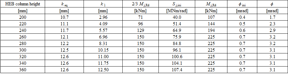 The joint components that are taken into account in this example are column web panel in shear k1 which equals infinity for a stiffened column and a single equivalent stiffness coefficient keq for end-plate joint with two or more bolt-rows in tension.