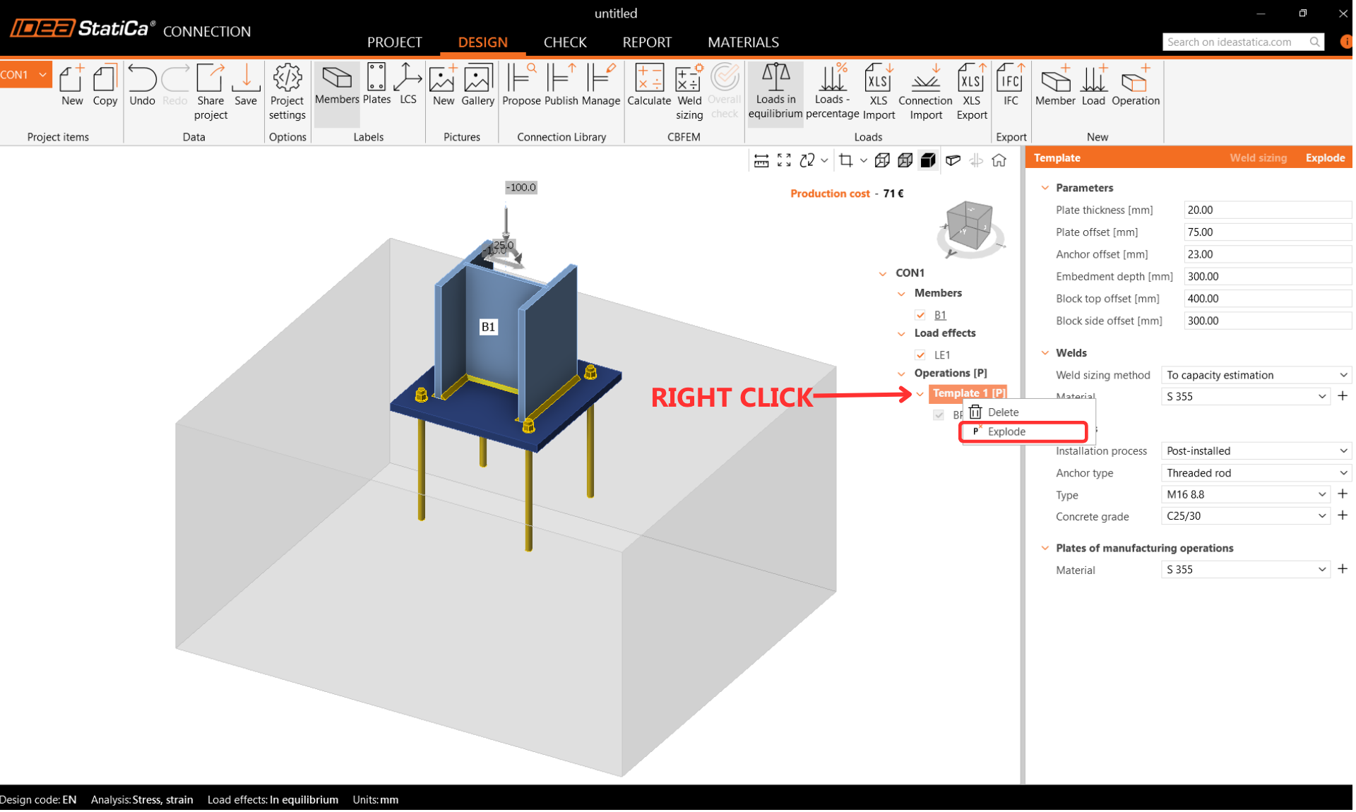 Po vytvoření přípoje z parametrické šablony musíme šablonu rozložit na jednotlivé operace, abychom mohli patku přesunout k okraji betonového bloku.