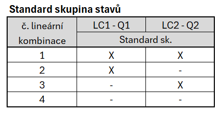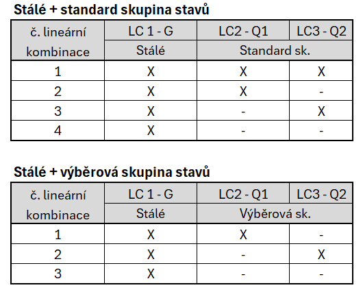 Veličiny ze Stálých zatěžovacích stavů jsou do lineární kombinace zahrnuty vždy, takže jsou přítomny v každé z lineárních kombinací.