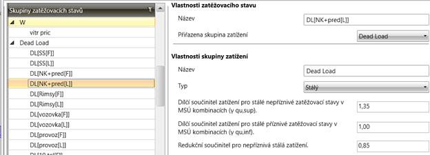 Např. stálá zatížení pak jsou obsažena jen v jednom stavu Dead load, který tak reprezentuje kumulovaná stálá zatížení ze všech fází na konci výstavby – poslední fázi. Naopak po importu do apliakci BIM se kumulativní stav Dead load rozpadne do dílčích přírůstkových stavů podle fází výstavby – vždy jeden pro začátek a jeden pro konec fáze. Toto se děje proto, aby byla apliakce BIM schopna „zreplikovat“ fázovaný výpočet konstrukce a např. správně nastavit postup předpínání a výchozí stav průřezu pro posudek v RCS. Jednotlivé přírůstkové stavy jsou v BIM pojmenovány DL<název fáze>[F] pro začátek fáze a DL<název fáze>[L] pro konec. A všechny tyto stavy jsou zařazeny do skupiny zatěžovacích stavů pojmenované Dead load, viz následující obrázek.