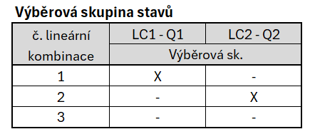 Pro zatěžovací stavy ze skupiny typu Výběrová platí, že v jednotlivých lineárních kombinacích se použije vždy jen jeden zatěžovací stav ze skupiny.