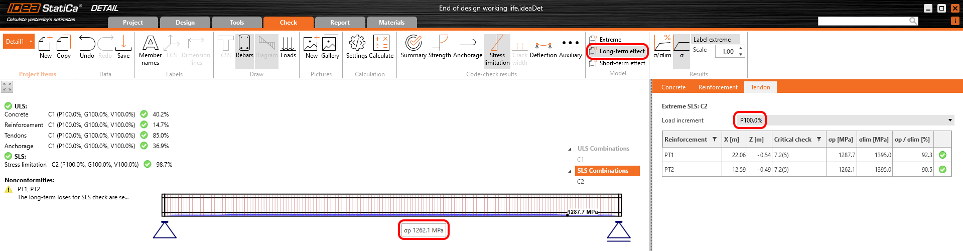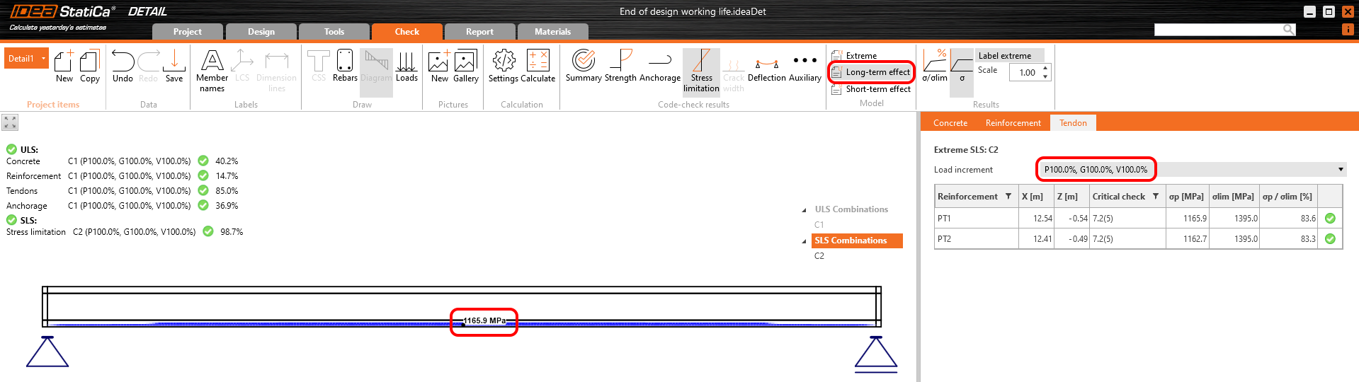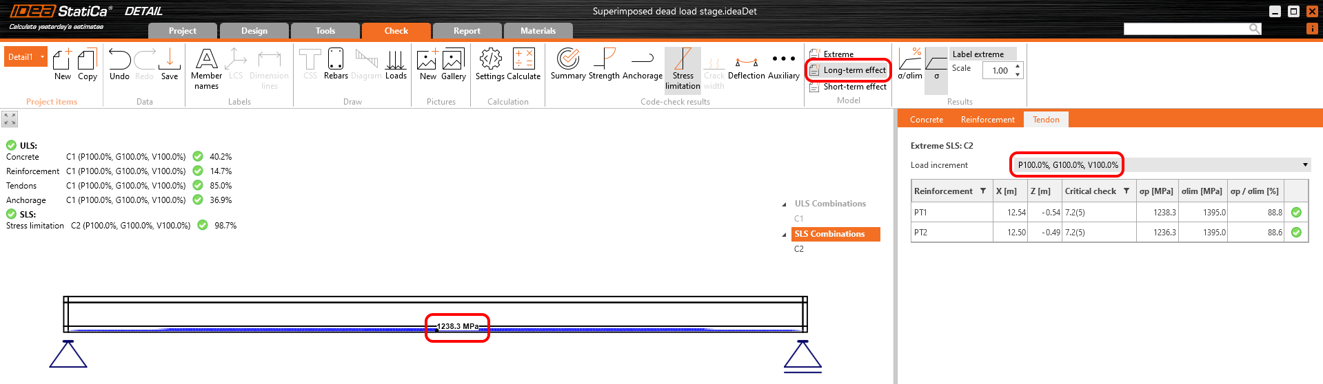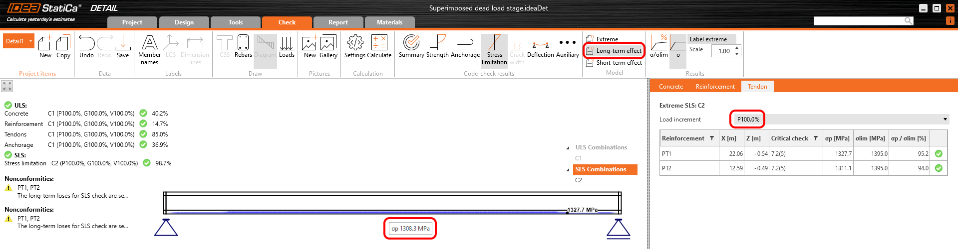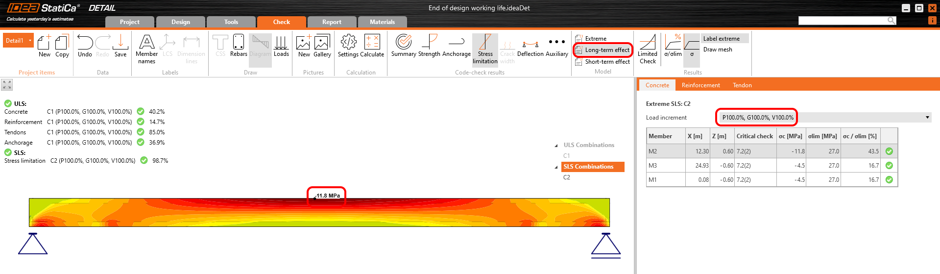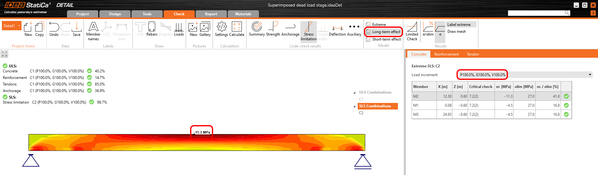 Poté je třeba vypočítat model v aplikaci Detail s nastaveným součinitelem dotvarování a s nulovými dlouhodobými ztrátami pro první přírůstek - P100 %, abychom určili σdet,60. Důležité je, že musíme odečíst výsledky pro dlouhodobé účinky, abychom měli započítaný součinitel dotvarování.