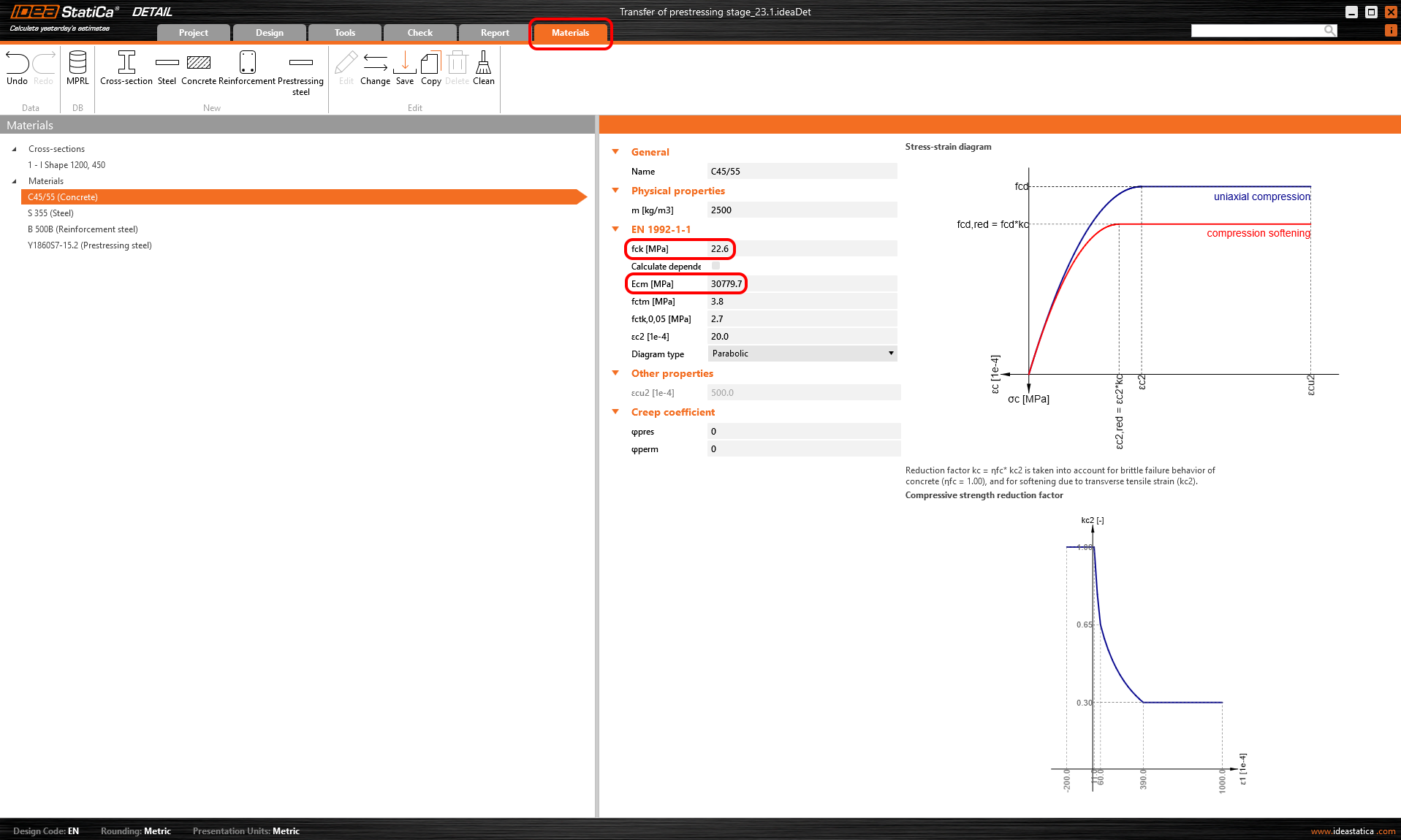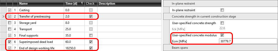 Součinitele dotvarování jsou rovněž nastaveny na nulovou hodnotu, protože chceme posoudit fázi těsně po vnesení předpětí. A jak vidíte, hodnota Ecm byla přepsána na stejnou hodnotu, kterou jsme zadali do aplikace Beam.