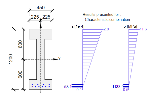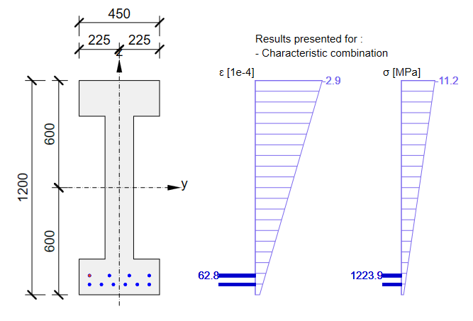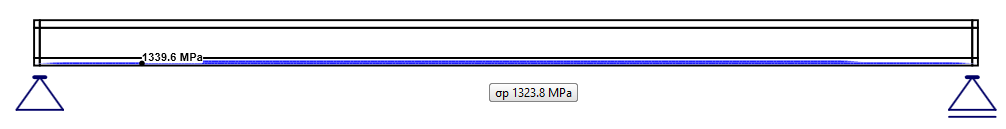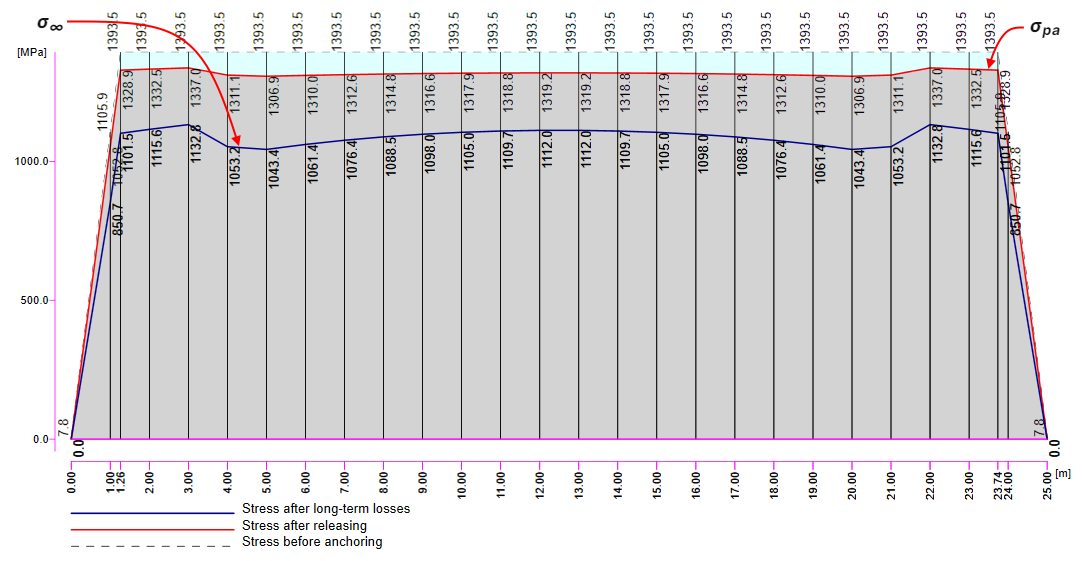 - σpa - Napětí po krátkodobých ztrátách. Jinými slovy se jedná o napětí po vnesení předpětí do prvku. Vypočítá se jako σpa = σpr,cor - ΔσpT - Δσpe = σpm0 - Δσpe. V našem příkladu σpa = 1319.2 MPa