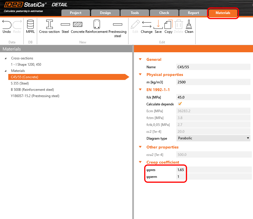 V aplikaci Detail lze součinitel dotvarování nastavit v části Materiály & modely. Je zřejmé, že modul pružnosti musí být nastaven jako výchozí hodnota Ecm (vzpomeňte si na kapitolu Úvod a výchozí předpoklady a graf v ní). Všimněte si také, že hodnota φperm = 0,0, což je dáno tím, že chceme použít stálá zatížení jako krátkodobá zatížení stejně jako proměnná zatížení.