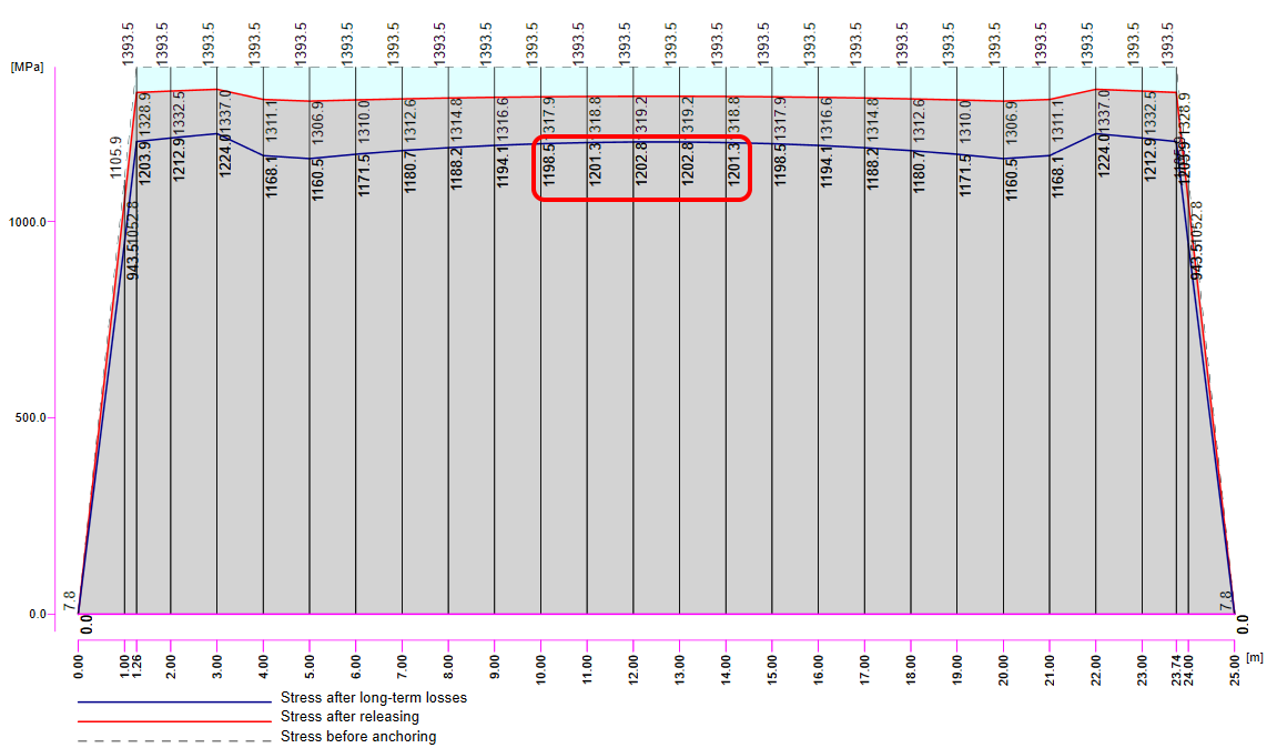 Stojí za to zopakovat, že u předem předpjatých lan je třeba zadat napětí těsně po uvolnění (ale před ztrátou v důsledku okamžitého pružného přetvoření betonu). Je třeba zadat odhad dlouhodobých ztrát v důsledku smršťování a relaxace. Ztráty relaxací se počítají automaticky.