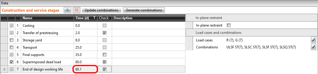 Čas (stáří betonu) pro tuto fázi je 60 dní. Účelem této fáze je posoudit betonový nosník na začátku jeho životnosti včetně stálého a proměnného zatížení. Proto se přidají další dva zatěžovací stavy. Zatěžovací impulsy jsou samozřejmě stejné jako v modelu v aplikaci Beam.