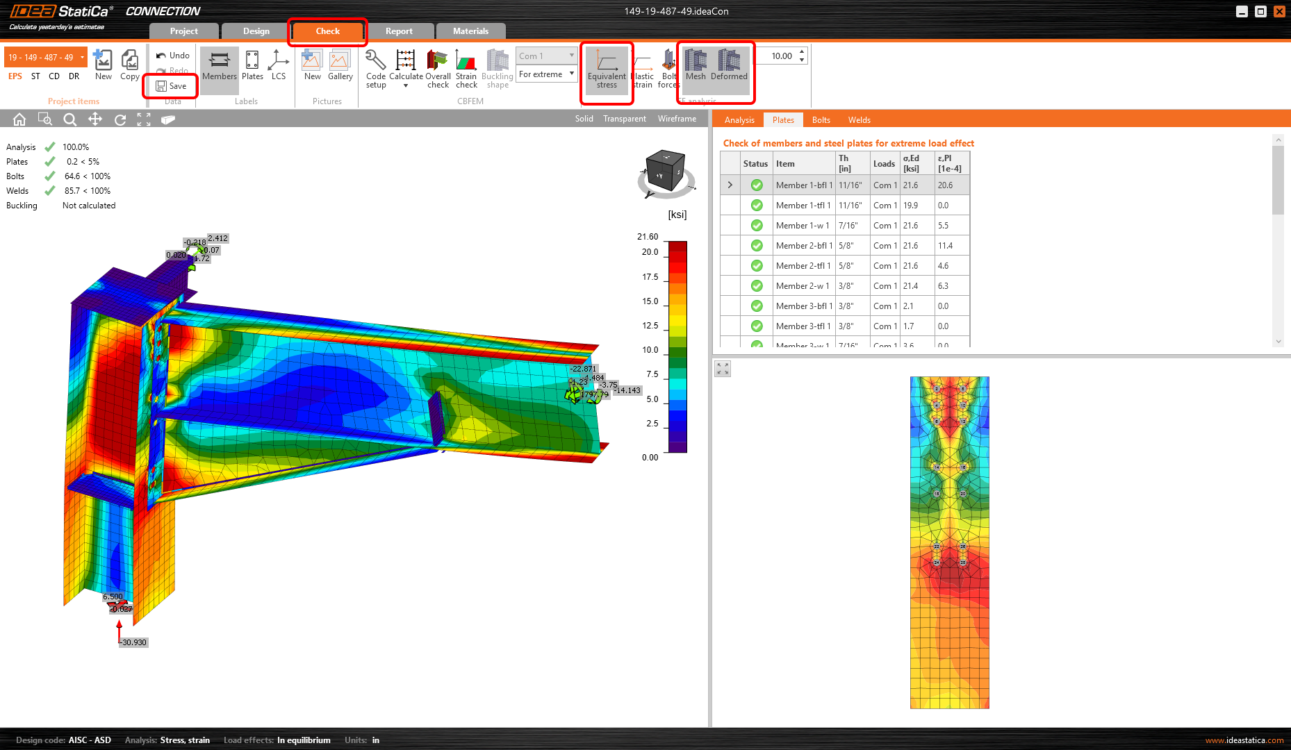Spusťte Výpočet přímo v kartě Návrh. Po skončení výpočtu se přepňete do karty Posudek a zapňete zobrazení Ekvivalentního napětí, Sítě a Deformovaného modelu. Můžete prozkoumat výsledky. Nyní jsme spokojení s návrhem styčníku a je třeba uložit všechny data pomocí příkazu Uložit. Nyní zavřete okno aplikace Connection.