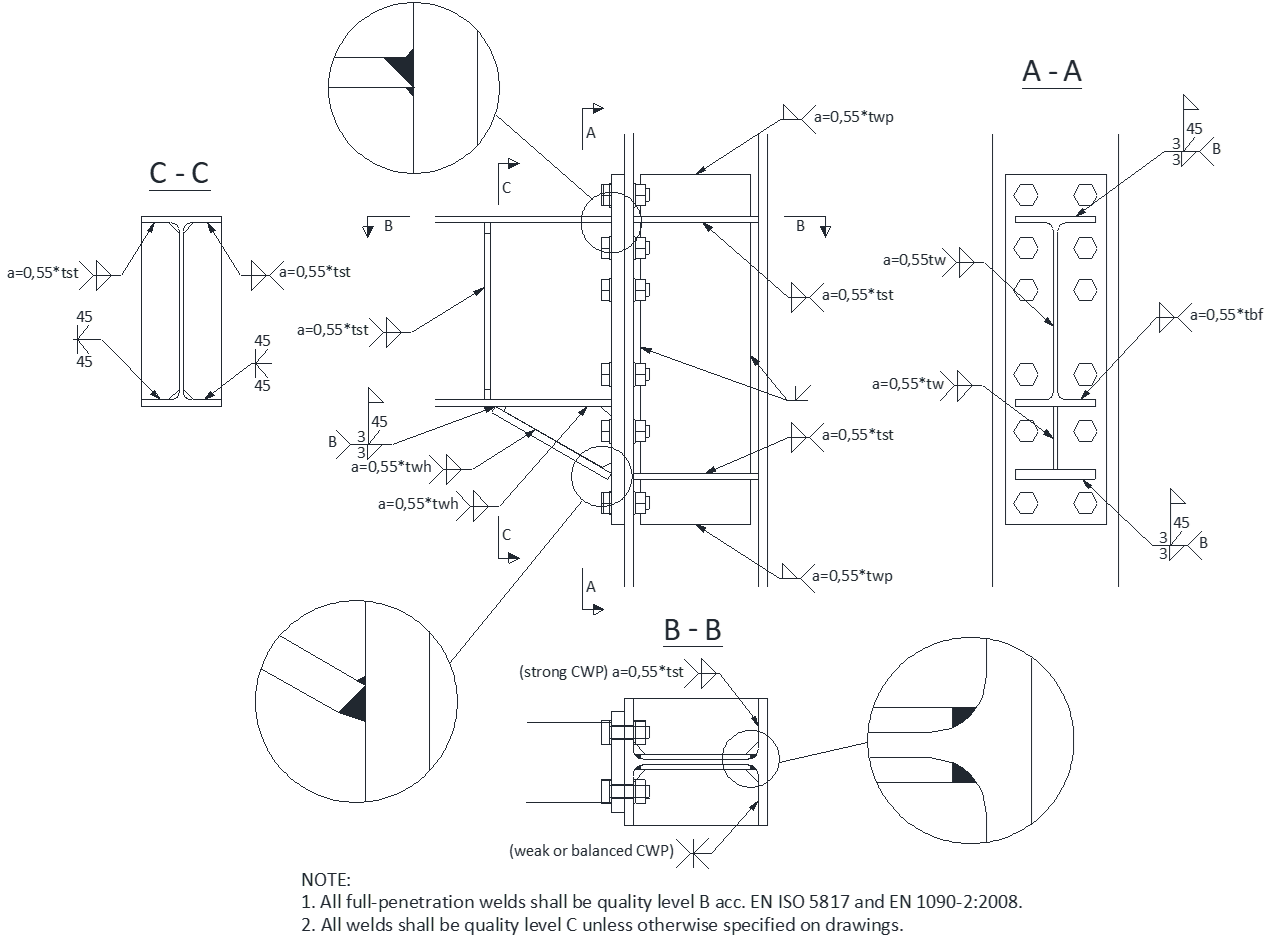 Konstrukční zásady uvedené v příslušných normách nejsou v aplikaci IDEA StatiCa Connection kontrolovány ale musí být dodrženy. Odolnost proti nízkocyklické únavě mnoha seismicky odolných spojů byla ověřena experimentálními zkouškami. Zejména detaily svarů jsou náchylné k únavovým trhlinám a pro přípoje disipativních prvků nestačí pouze standardní posudek svarů. Příklady detailů svarů předepsaných v projektu EQUALJOINTS jsou uvedeny níže.