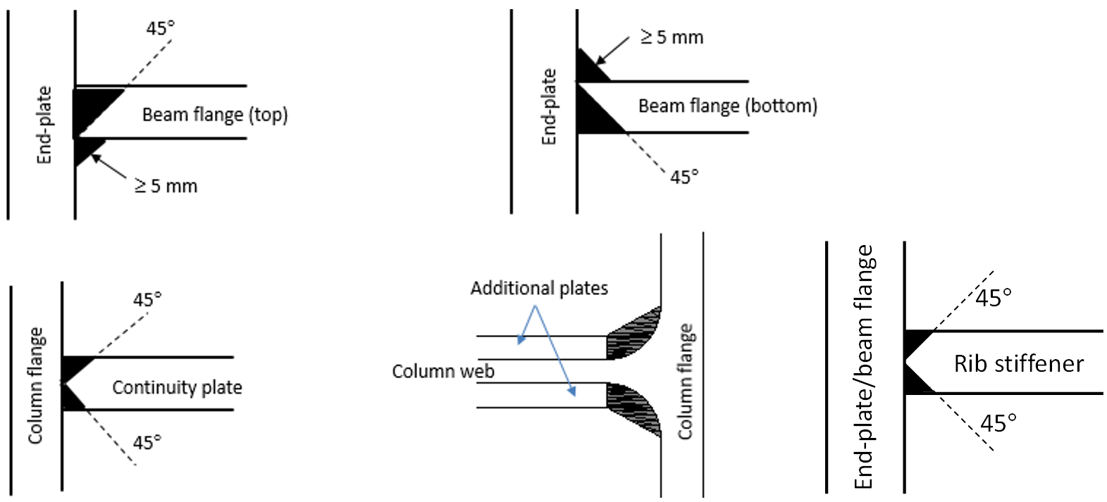 Detaily svarů pro styčníky s čelní deskou a náběhy: