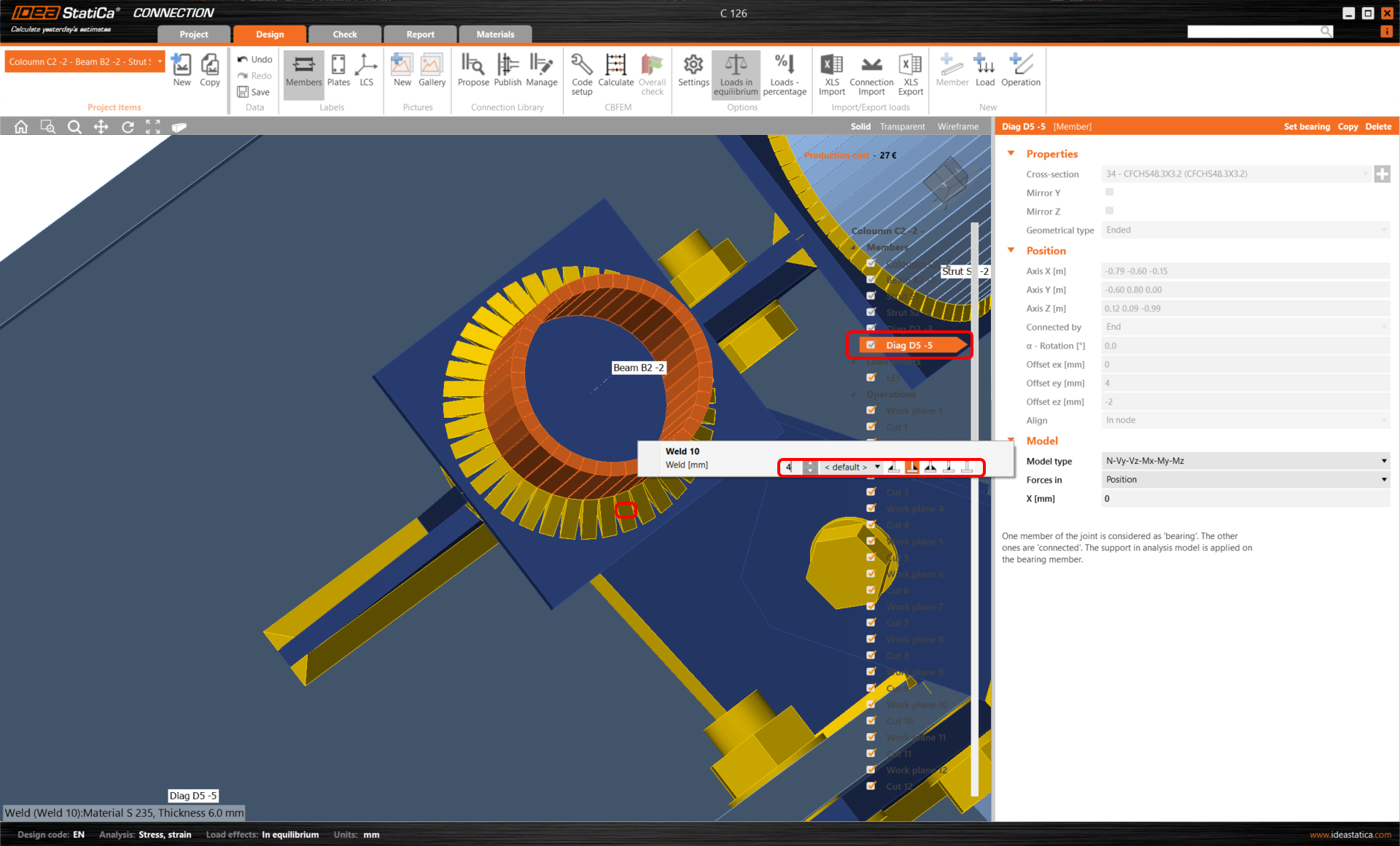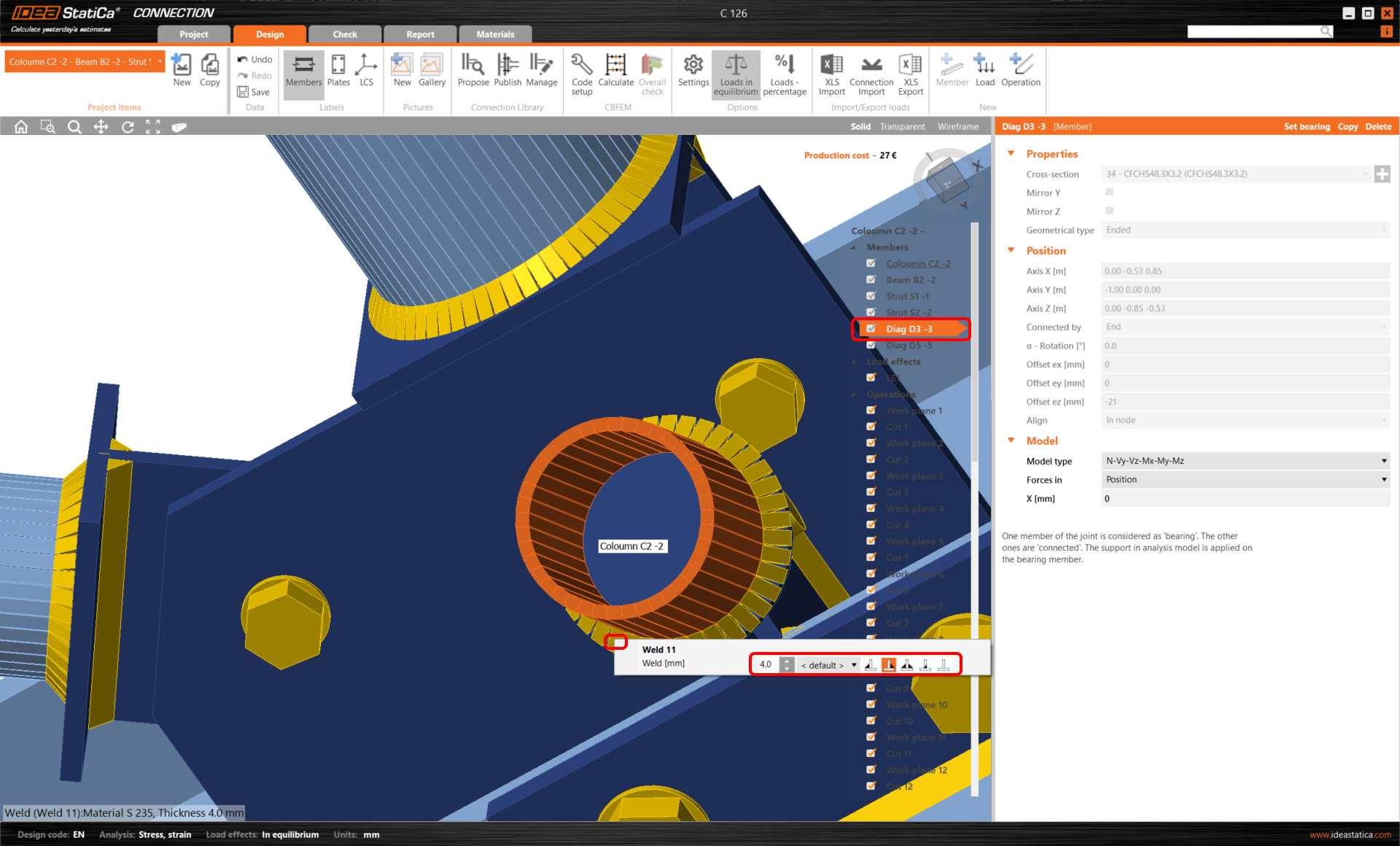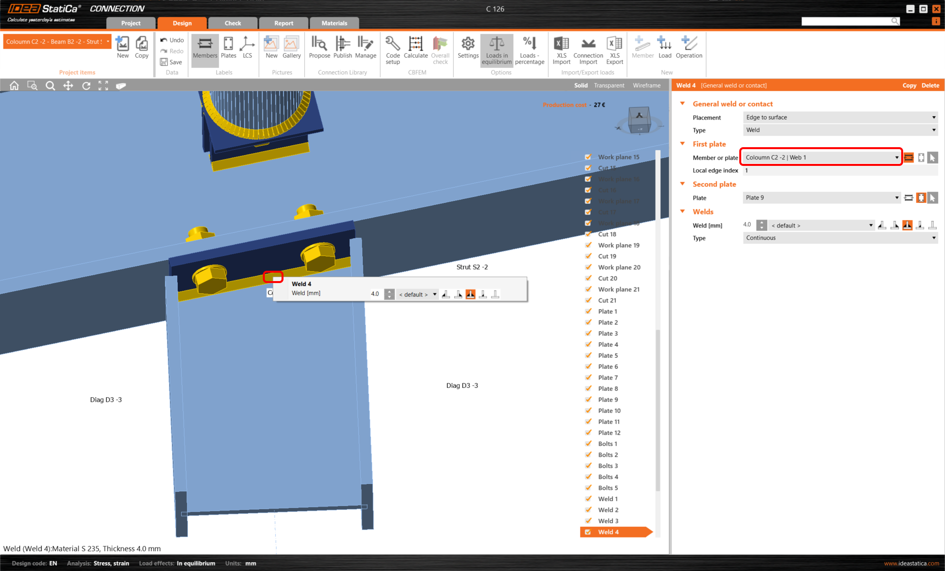 U prutu Strut S1-1 změníme velikost svaru na 4 mm a orientaci na zadní stranu.