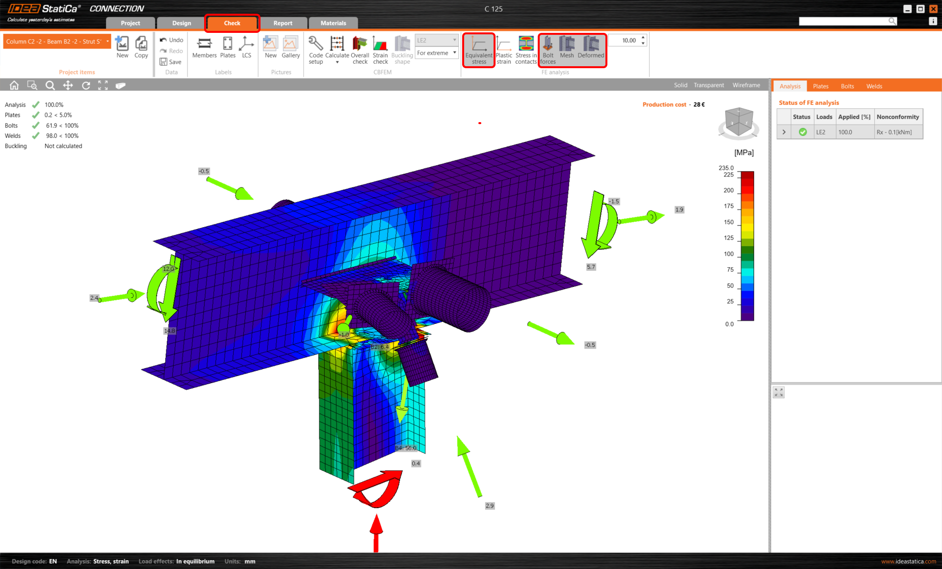 Nyní spusťte normový výpočet pomocí ikony Výpočet na panelu CBFEM na horní liště. V aplikaci IDEA StatiCa Connection můžete provádět mnoho různých typů analýz. Více informací naleznete zde.
