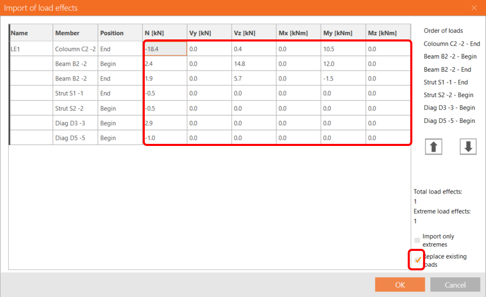 Uvědomte si, že v tabulce aplikace Excel musíte mít stejné pořadí řádků a sloupců jako v tabulce Zatěžovací účinky v aplikaci IDEA StatiCa Connection. Pokud řádky nebo sloupce prohodíte, získáte nesprávné zadání vnitřních sil na prutech.