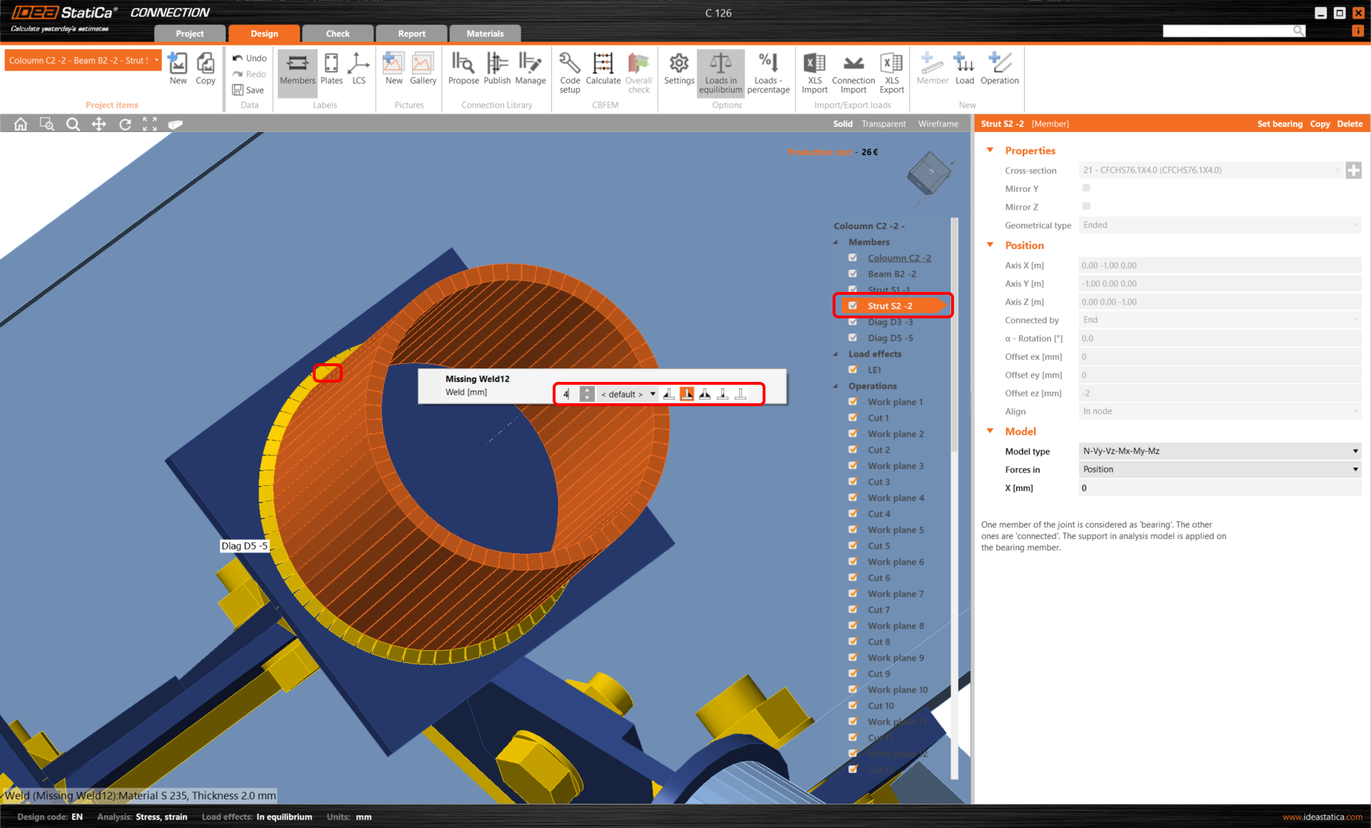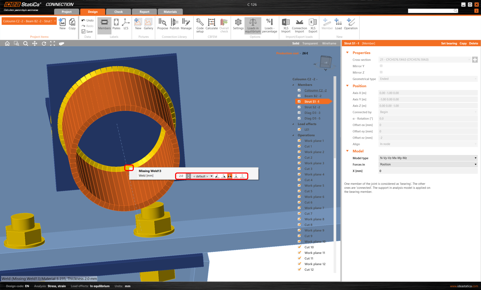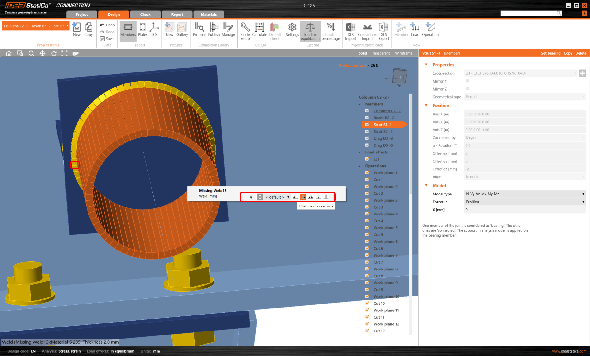 U prutu Strut S2-2 změňte velikost svaru na 4 mm a orientaci na zadní stranu.