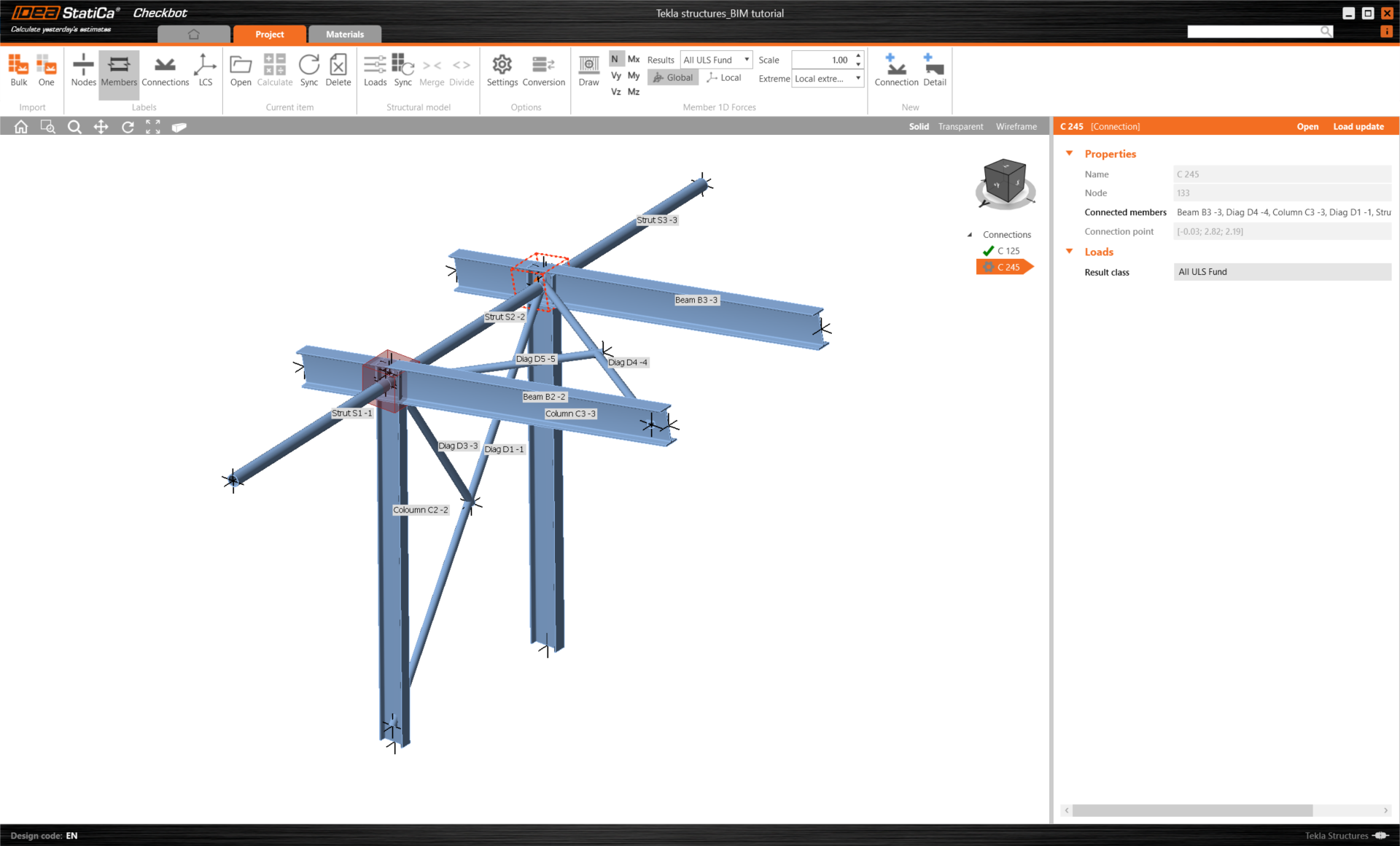 Tím se všechny vybrané části konstrukce importují do Checkbotu - se stejnými souřadnicemi, orientací a průřezem jako v modelu BIM. Střed přípoje určíte podle průsečíku prutů.