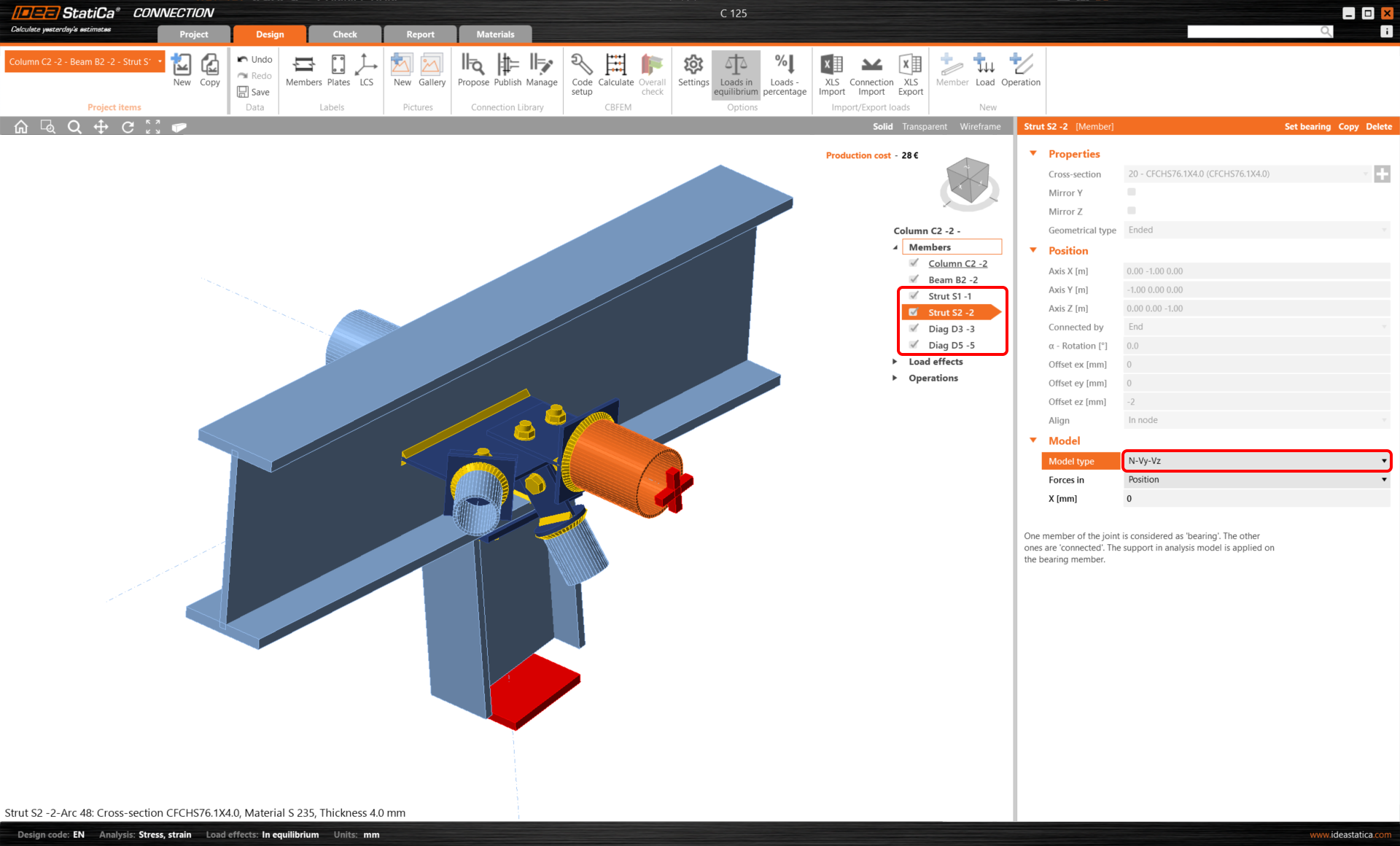 Pro distanční a ztužidlové prvky budeme používat spoj s jedním šroubem. Pro tento typ spoje musíme také změnit typ modelu prutu na N-Vy-Vz. Vybereme v seznamu Prvky: Strut S1-1, Strut S1-2, Diag D3-3, Diag D5-5 a v rozevíracím seznamu upravíme Typ modelu.