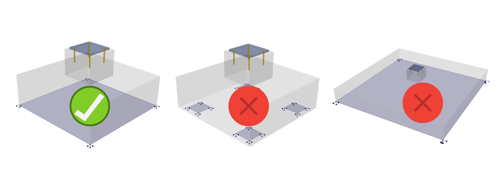 Z tohoto důvodu je 3D modul vhodný použít pouze pro kontrolu kotvení. Ačkoli je možné modelovat například pilotový základ pomocí podpor odpovídající ploše průřezu piloty, posouzení není spolehlivé, protože efekt změkčení se stává významným zejména u případů souvisejících s protlačením. Stejná situace může nastat v případě tenké desky se sloupem na ní umístěným a v dalších podobných případech.