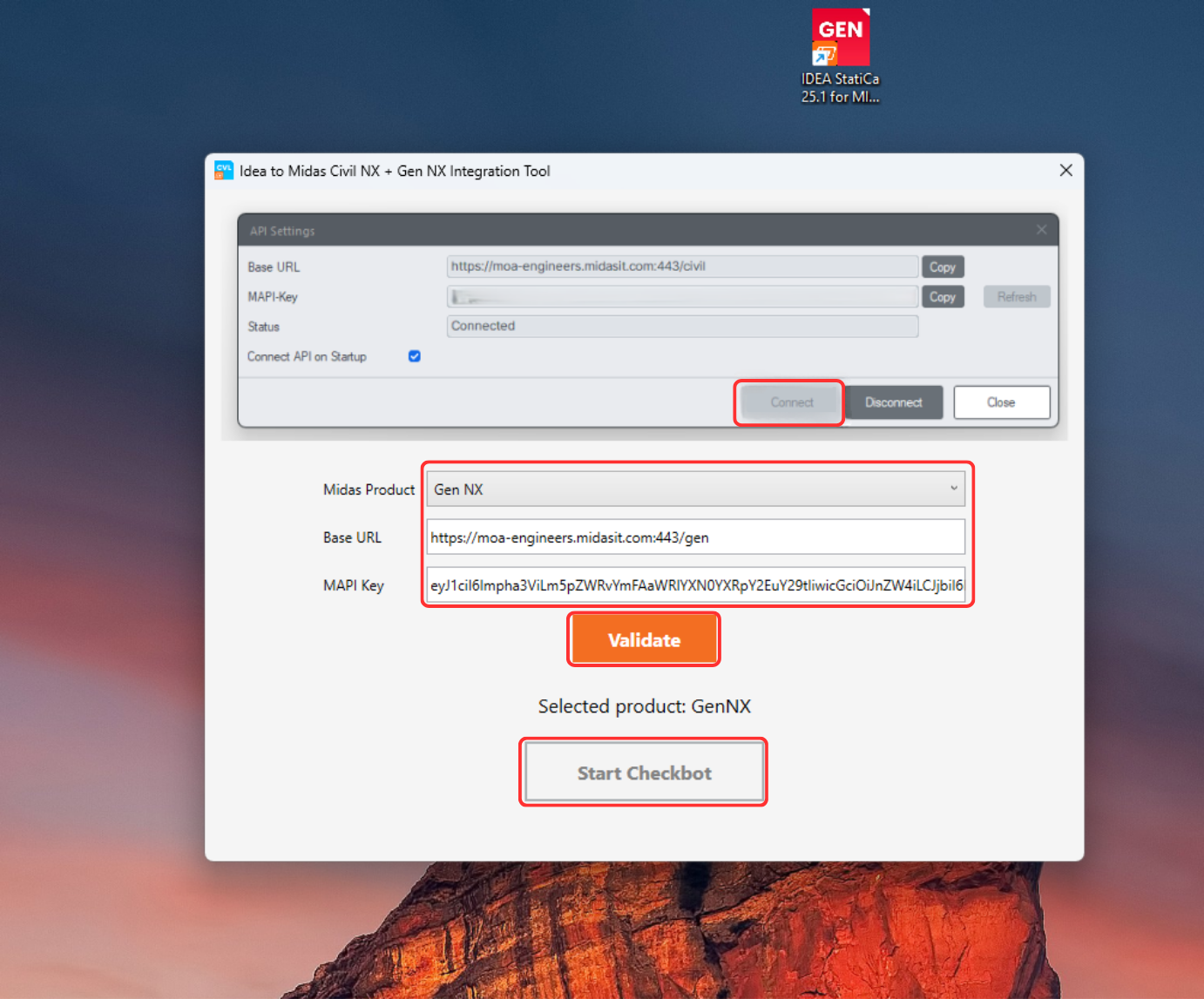 Open the IDEA to MIDAS GEN NX Integration Tool from the Desktop and paste the copied Base URL and MAPI Key from your opened MIDAS GEN NX project (1). Then, Validate (2) and connect to Civil NX (3). After that, Start Checkbot (4).