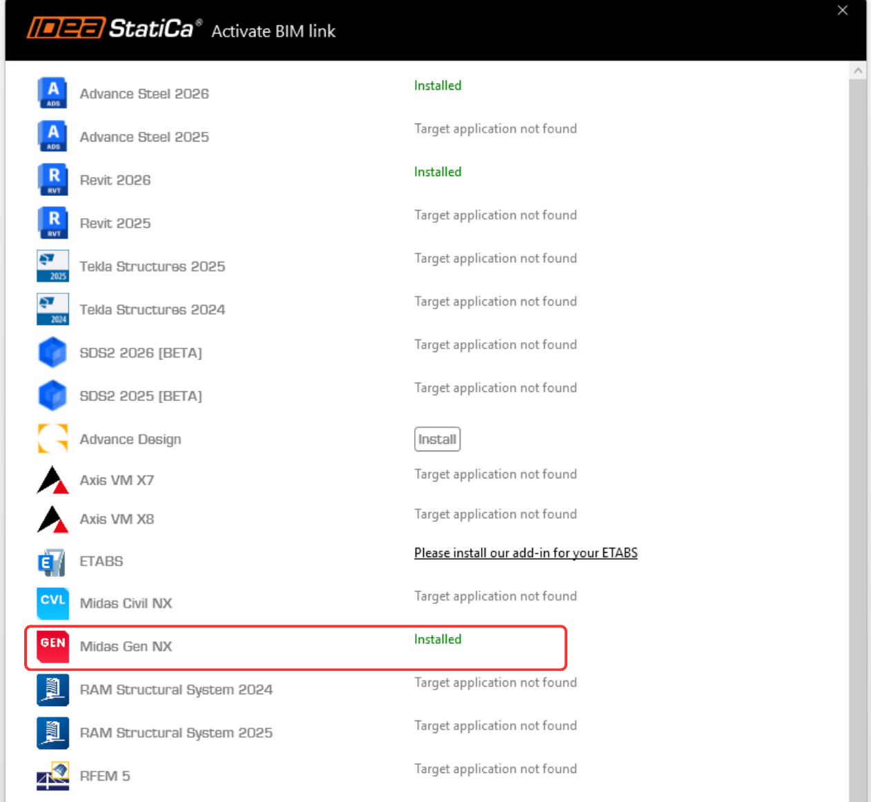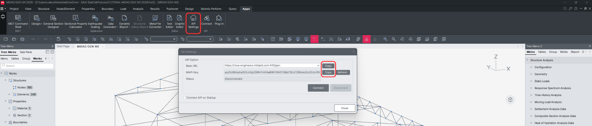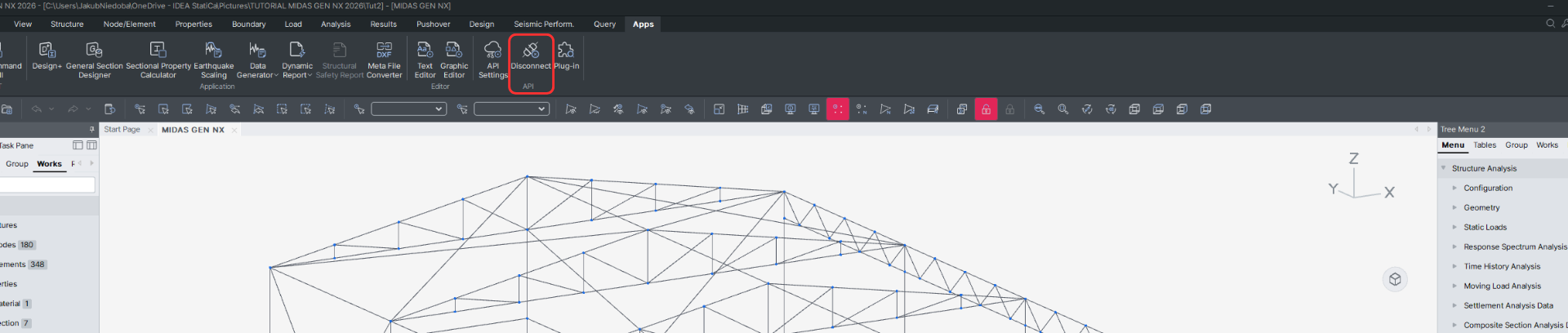 Since version MIDAS GEN NX 2026 (V1.1) and newer, the API has been added, and due to this new possibility, the new link to IDEA Statica Checkbot was created.