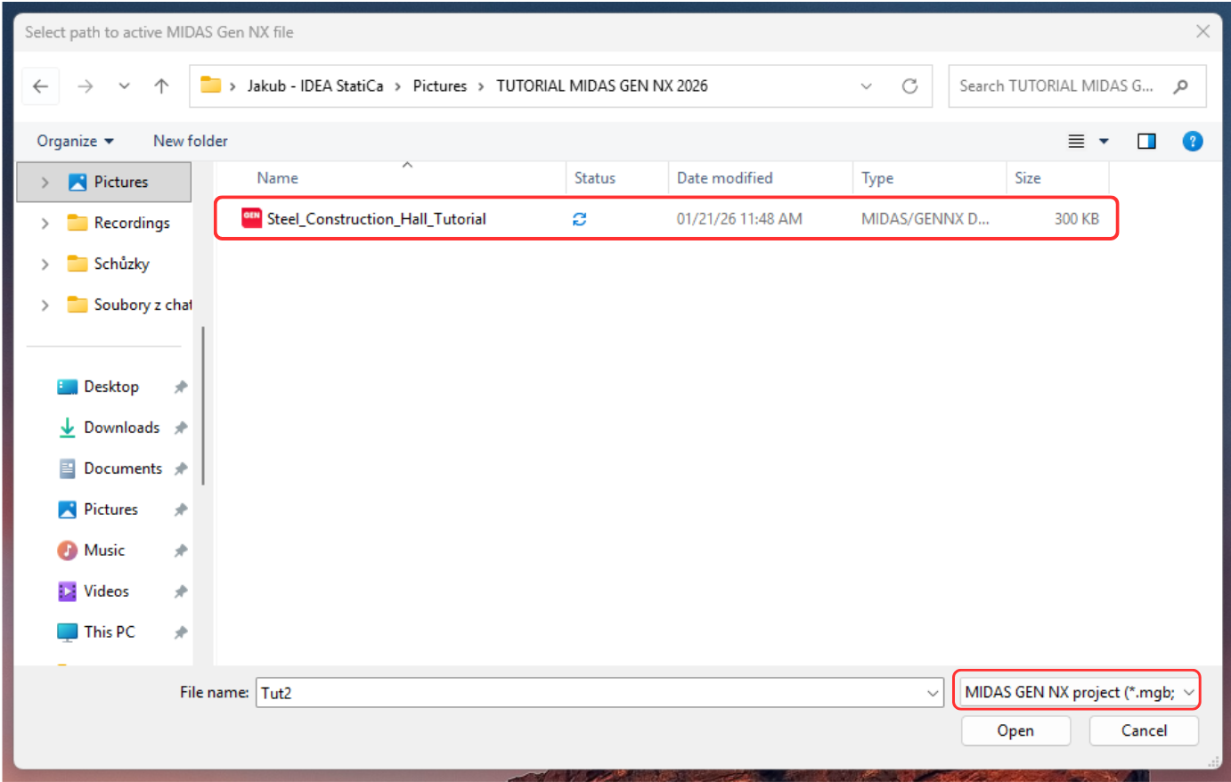 Select the path to the active MIDAS GEN NX file and open it. Both .mgb and .mgbz file formats can be chosen.