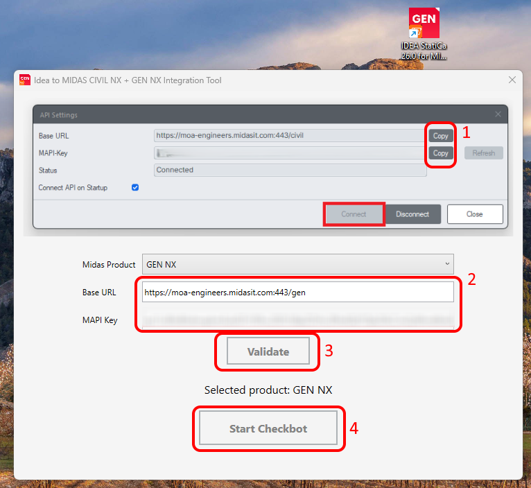 Open the IDEA to MIDAS GEN NX Integration Tool from the Desktop and paste the copied Base URL and MAPI Key from your opened MIDAS GEN NX project (1). Then, Validate (2) and connect to GEN NX (3). After that, Start Checkbot (4).