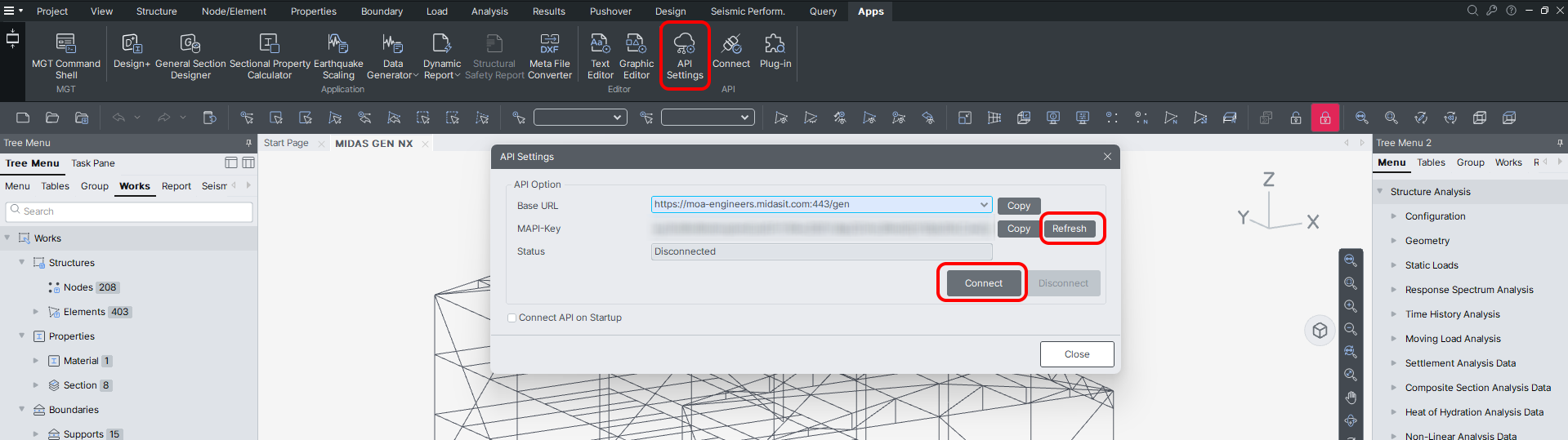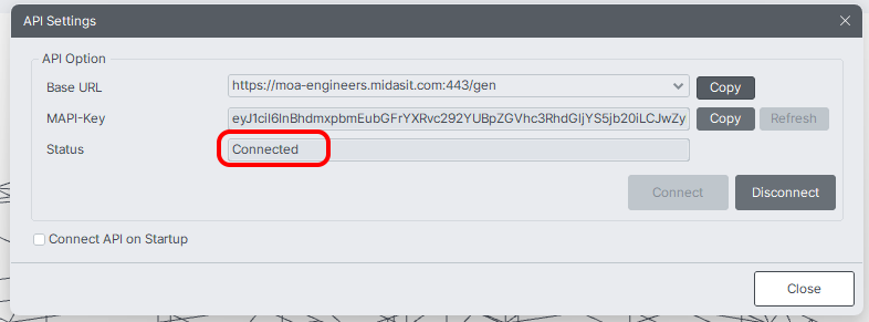*NOTE: Enabling Connect API on Startup automatically establishes the link between MIDAS GEN NX and IDEA StatiCa Checkbot upon launch, eliminating the need for manual API activation.