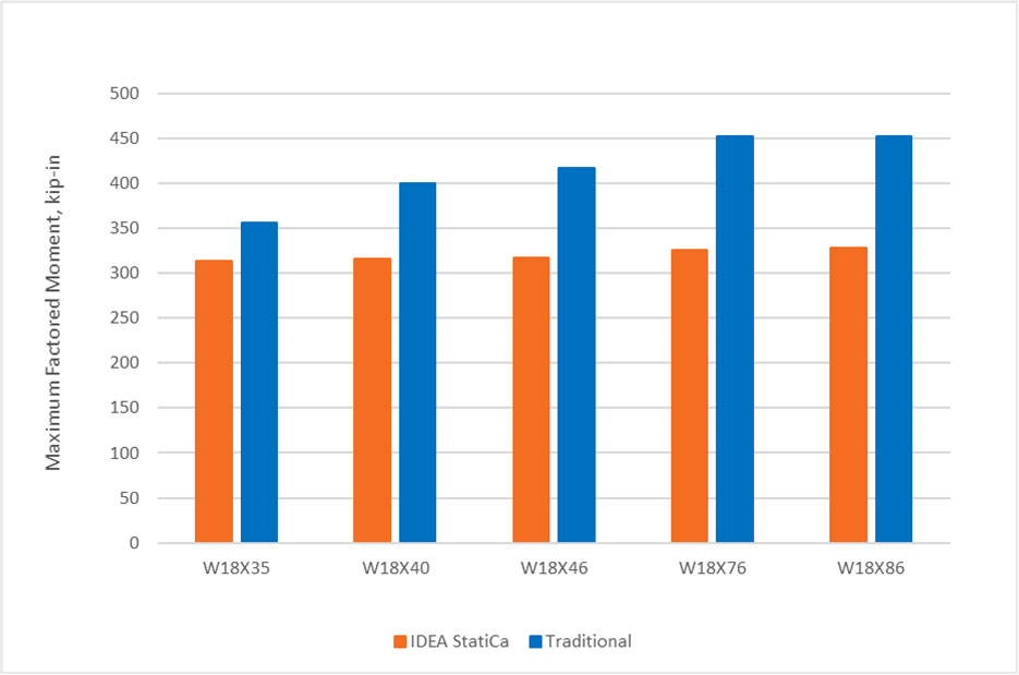 The maximum factored moment is presented in Fig. 2. The limiting buckling factor of 3.00 controlled the strength of all connections in IDEA StatiCa. The strength increases slightly from 314 kip-in to 328 kip-in as the beam size increased and more evenly distributed the load to the wall of the HSS. An example of the buckling mode computed by IDEA StatiCa is presented in Fig. 3.