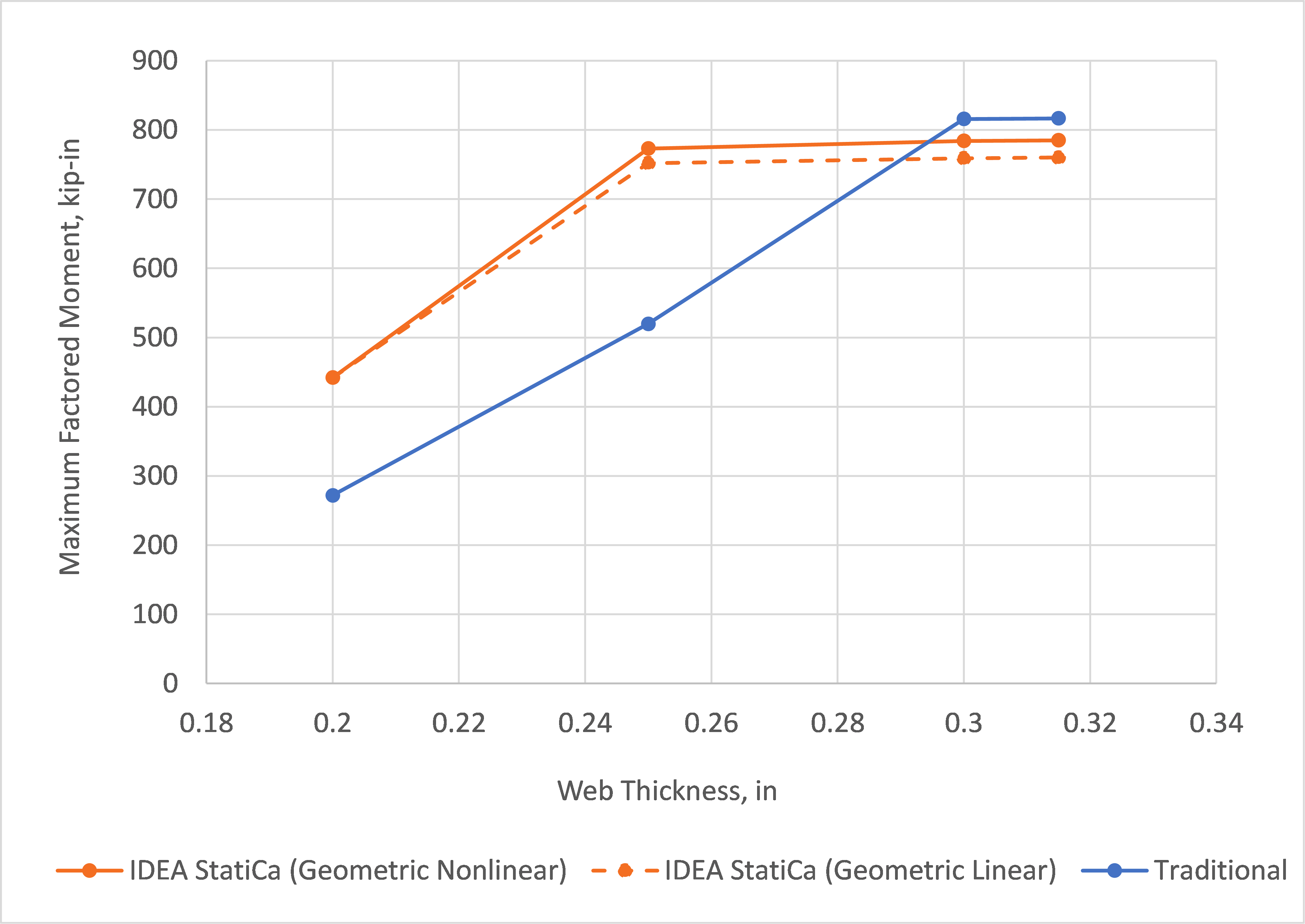 The maximum factored moment is presented in Fig. 4. The controlling limit state for each analysis is presented in Table 1. The beam web local limit states controlled when the thickness was reduced significantly. The buckling mode computed by IDEA StatiCa for the analysis with beam web thickness of 0.20 in. is presented in Fig. 5. For larger thicknesses, the tension side of the connection controlled with bending of the cap plate, bending of the beam flange, bolt tension, or a combination of these limit states controlling. Analyses were performed in IDEA StatiCa with geometric nonlinearity on and geometric nonlinearity off. Both sets of results are presented in Fig. 4. There is only a small difference between the two.