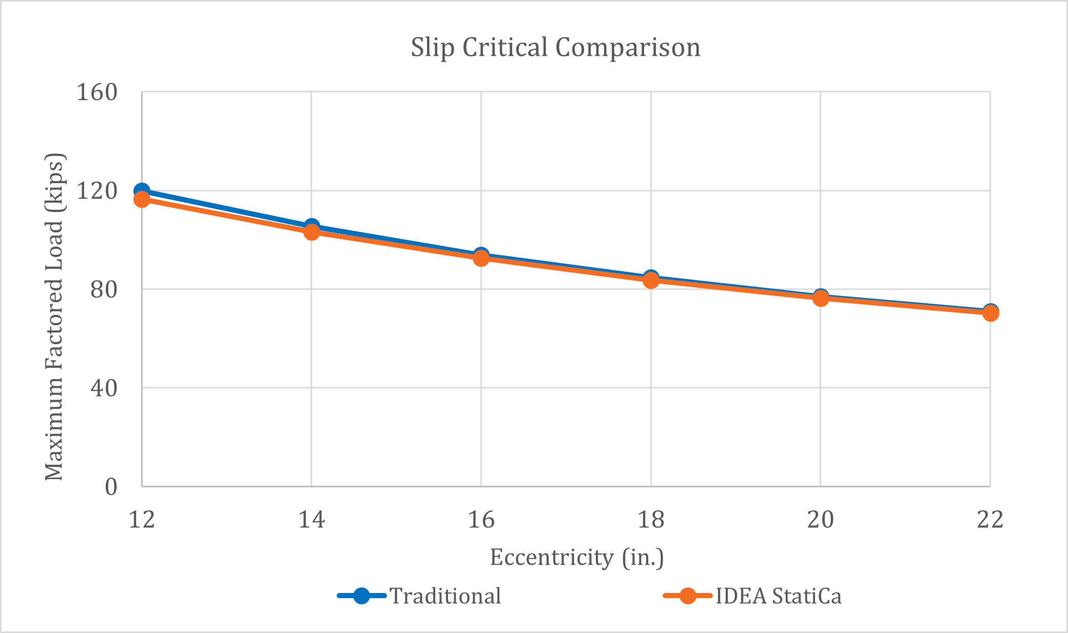 The instantaneous center of rotation method is also applicable to slip critical connections even though the mechanics of force transfer are different than those assumed in the method. The results of a comparison using the same connection parameters as for the connection explored in Section 3 but for a slip critical connection are presented in Fig. 8. The average difference between the IDEA StatiCa results and traditional US methods is about 1.5%.