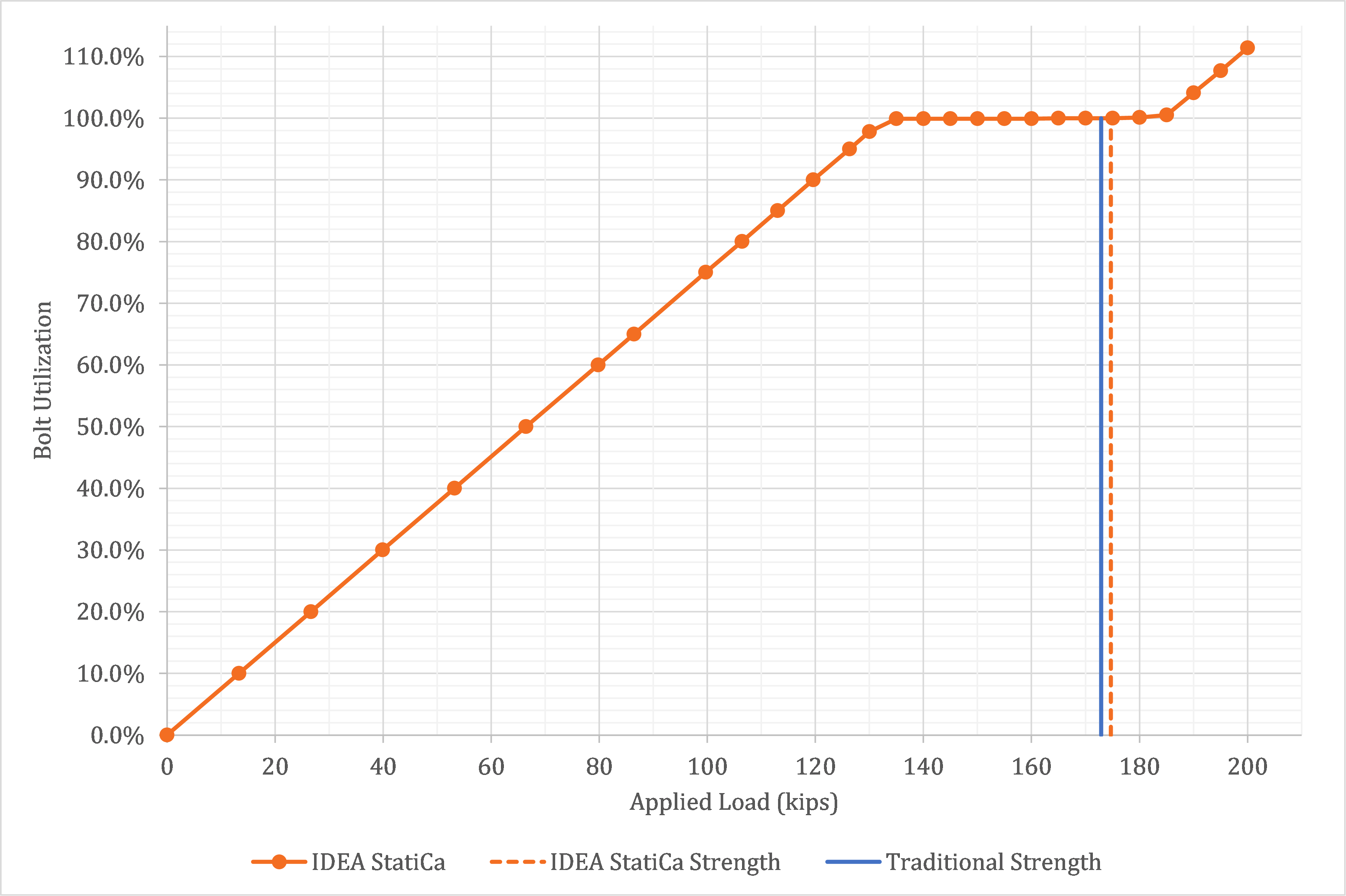 The first investigation explores how the bolt utilization percentage varies with applied load. For one value of eccentricity, e = 16 in., the applied load was varied from 0 to 200 kips and the bolt utilization percentage as reported by IDEA StatiCa was recorded. The results are presented in Fig. 3. The relationship between applied load and bolt utilization percentage is essentially linear until an applied load of roughly 135 kips at which point the bolt utilization percentage plateaus at near 100% until an applied load of roughly 185 kips at which point the bolt utilization percentage again increases linearly.  The load at which failure of the bolts indicated by IDEA StatiCa (i.e., with a red “x”) occurs later in the plateau, at an applied load of 174.7 kips. The strength of this connection per the traditional calculations is 172.6 kips.