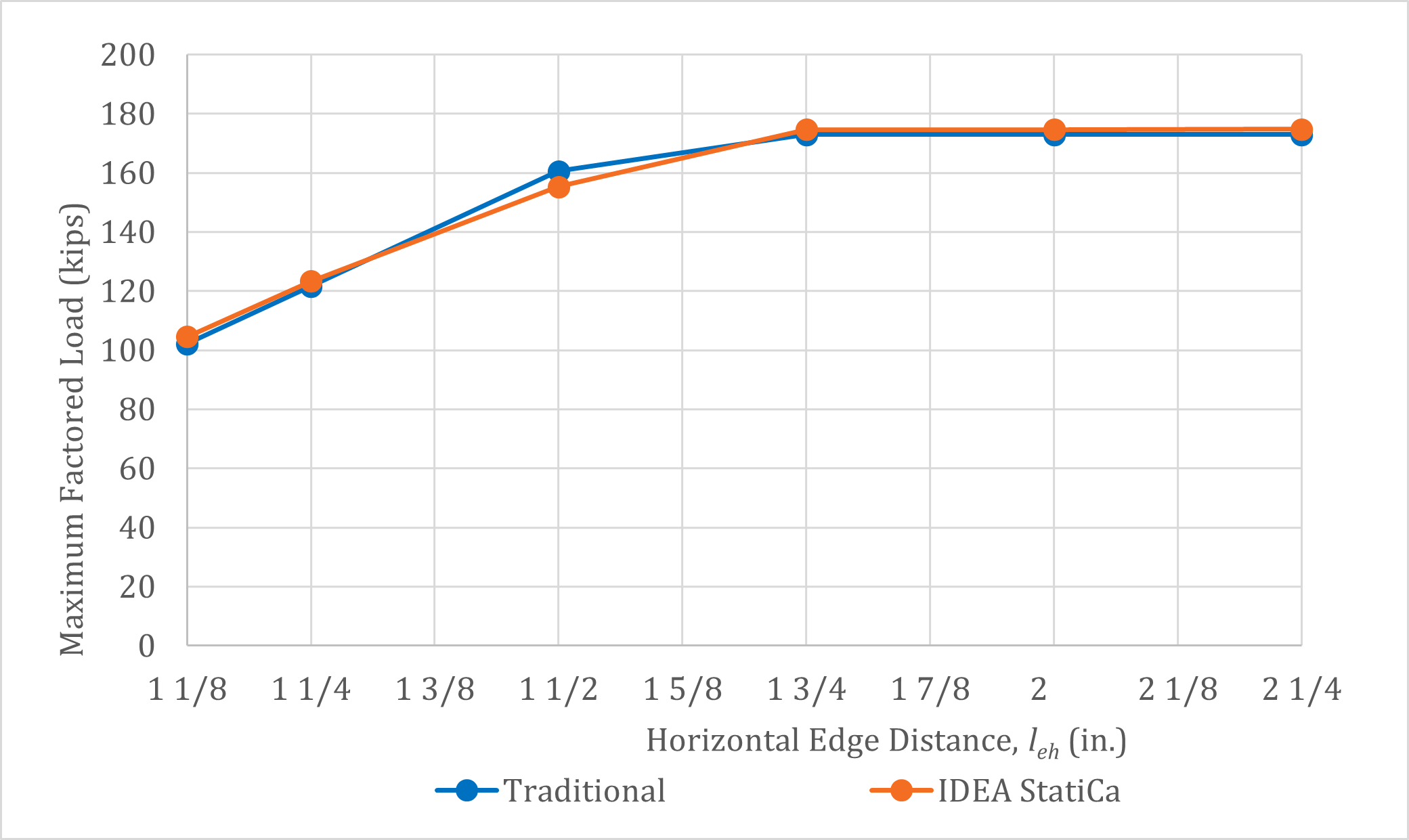 A comparison between IDEA StatiCa results and results from traditional calculations using the poison bolt method are shown in Fig. 7. The connection for this comparison is like that described in Section 2 but with a bracket plate thickness of 3/8 in. and varying horizontal edge distance, leh. The edge distance varies between 1.125 in., the minimum edge distance per Table J3.4 of the AISC Specification (2016), and 2.25 in., a value at which bolt shear rupture will control over tearout. The results show close agreement, indicating that IDEA StatiCa is appropriately considering the effects of tearout in eccentrically loaded bolt groups.