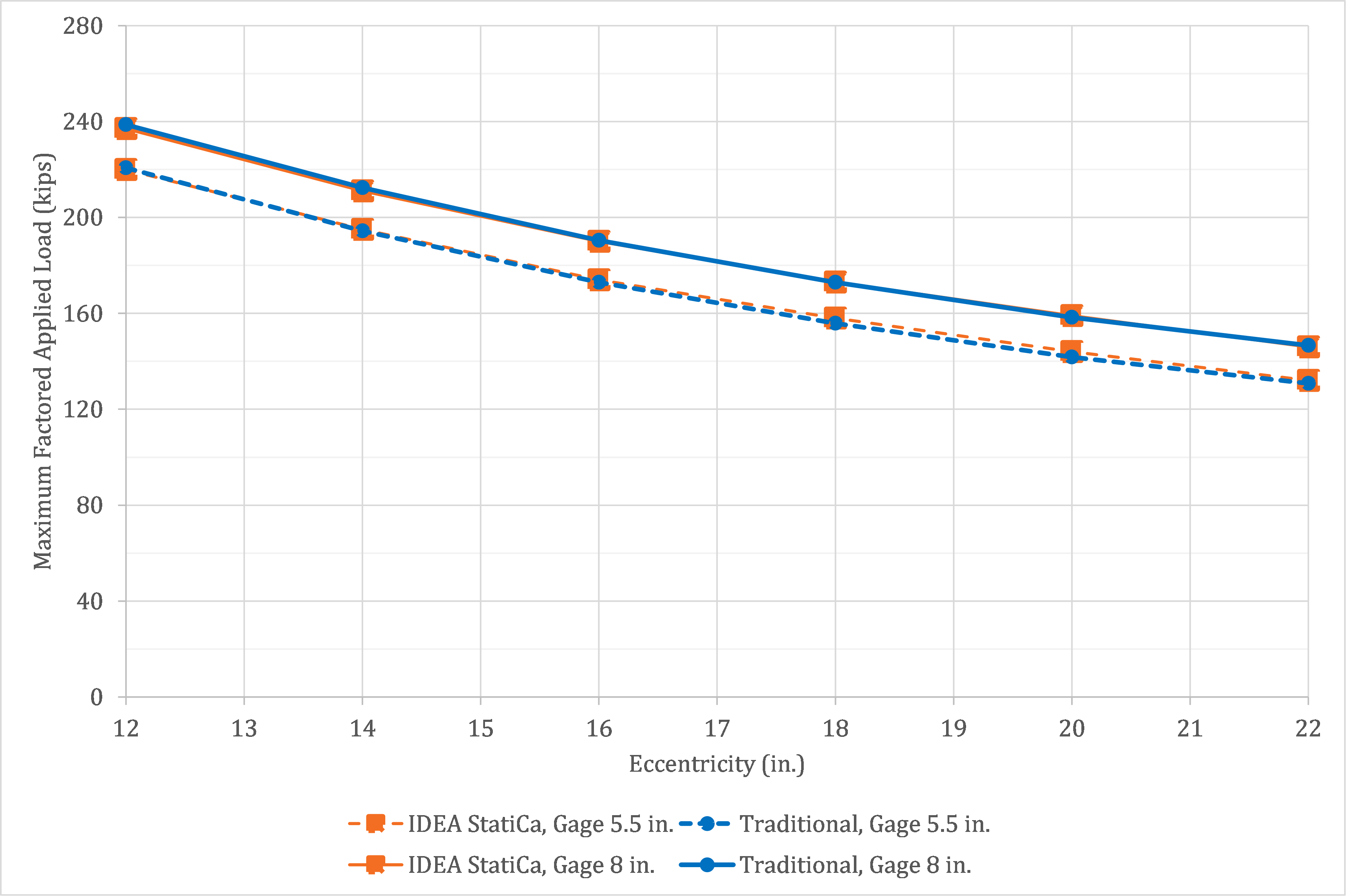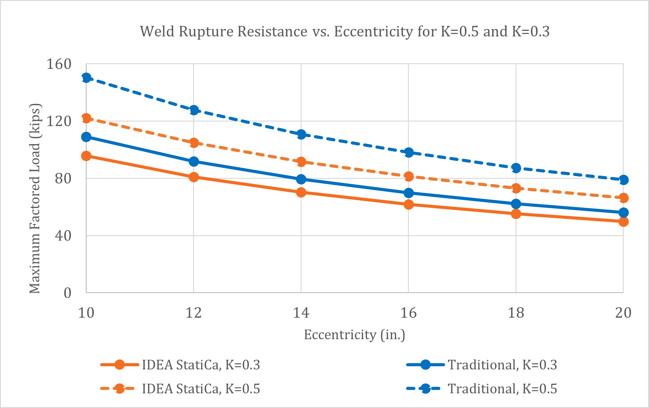 The strength of the connections per IDEA StatiCa and the traditional calculations for a range of eccentricities are presented in Fig. 11. As expected, and like the bolted connections, the maximum permitted applied load decreases with increasing eccentricity. The results show a relatively uniform level of conservatism for IDEA StatiCa as compared to traditional US practice. The case with k = 0.5 exhibits an average difference of approximately 17%, whereas the case with k = 0.3 exhibits an average difference of approximately 12%.