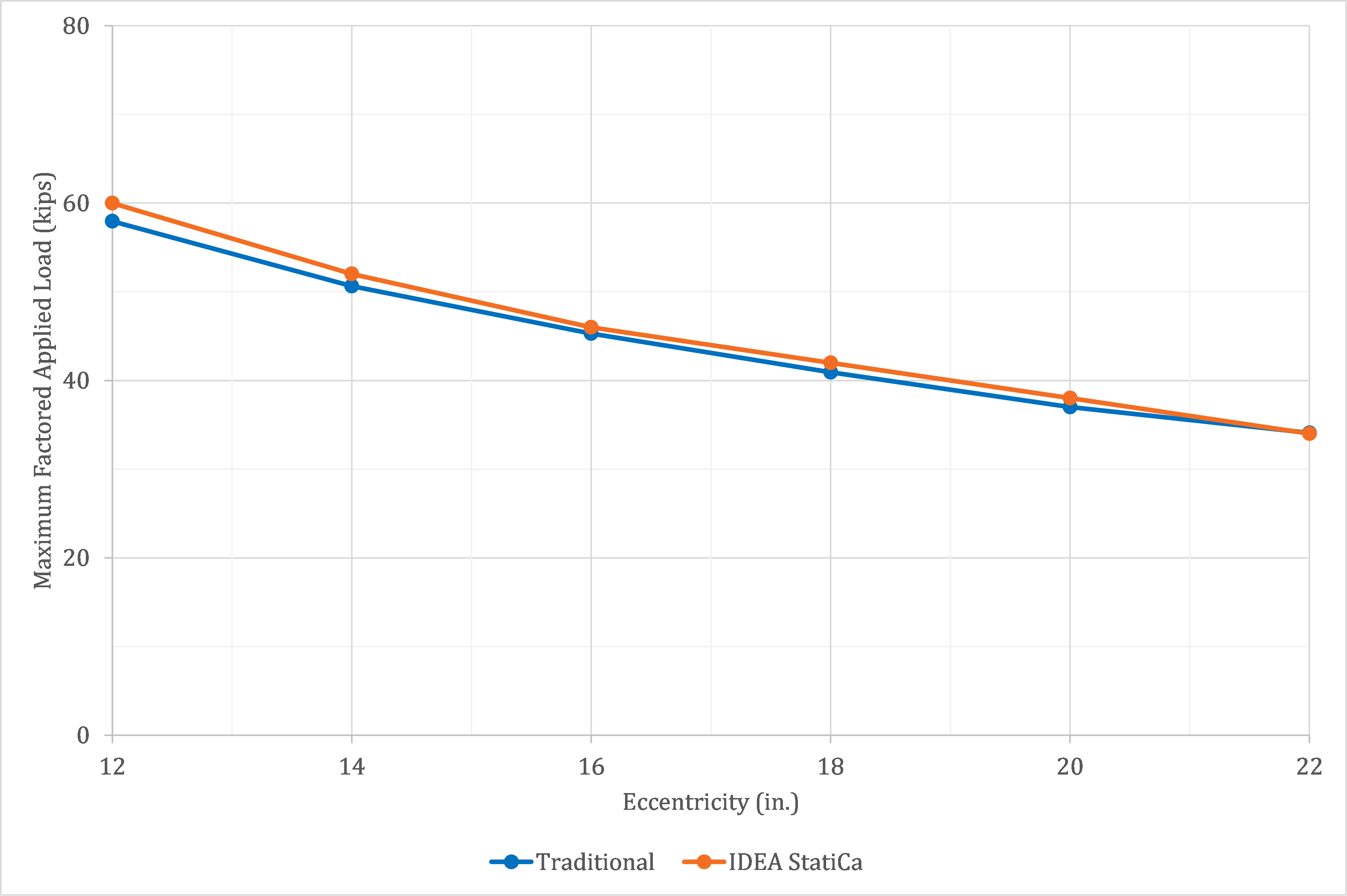 These strength results for the same connection and a range of values of eccentricity are presented in Fig. 4. As expected, the maximum permitted applied load decreases with increasing eccentricity. The results from IDEA StatiCa are in close agreement with the traditional calculations.