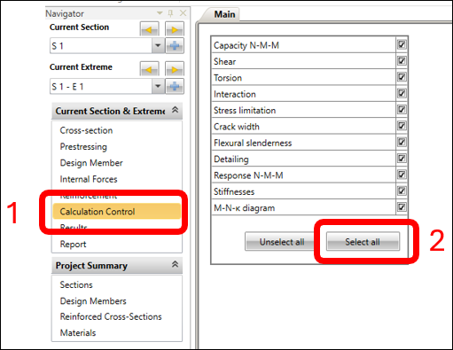 To show all performed verifications, in the CALCULATION CONTROL Navigator Window under the MAIN tab, click on SELECT ALL.